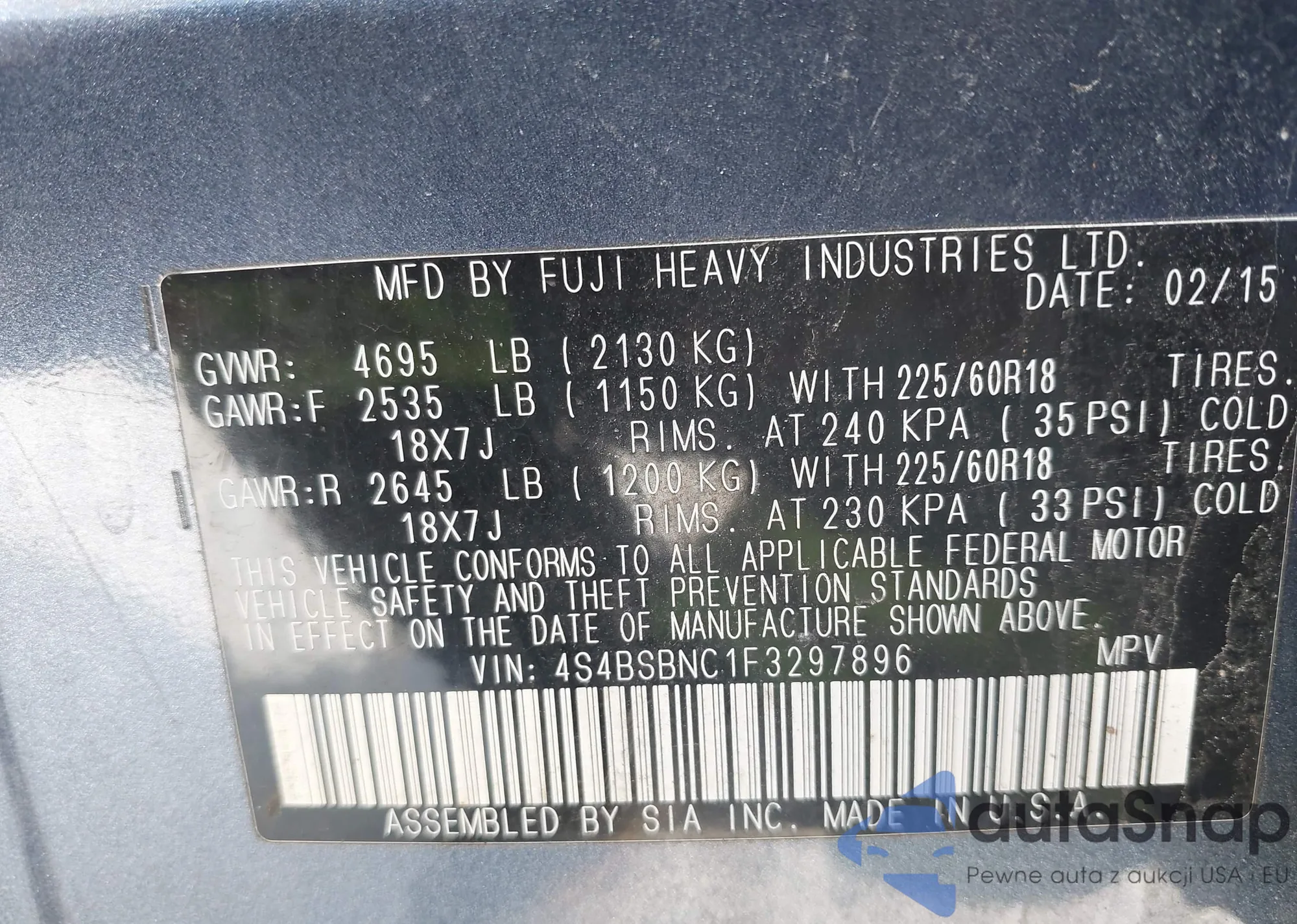 Samochód Subaru Outback 2015 (VIN 4S4BSBNC1F3297896) nie był wcześniej licytowany. Dokumenty są czyste, przebieg odpowiada lub jest niższy niż średnia rynku. Sprzedaje go firma ubezpieczeniowa – polecamy zakup. Dostawa do portu zajmie ok. 6–8 tygodni.