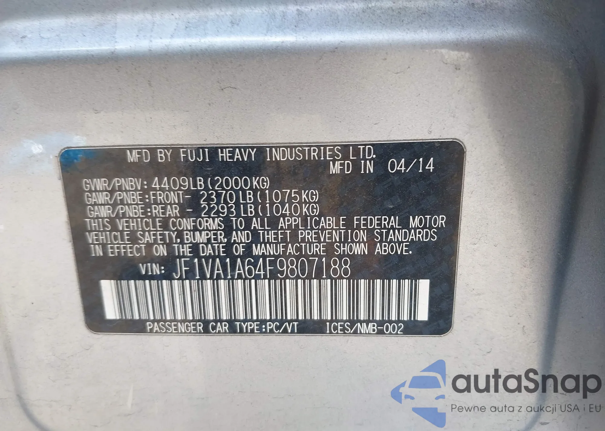 Samochód Subaru WRX 2015 (VIN JF1VA1A64F9807188) ma dokumenty uniemożliwiające rejestrację. Mogą pojawić się trudności przy eksporcie i rejestracji. Skontaktuj się z ekspertami AutaSnap w celu znalezienia alternatywy.