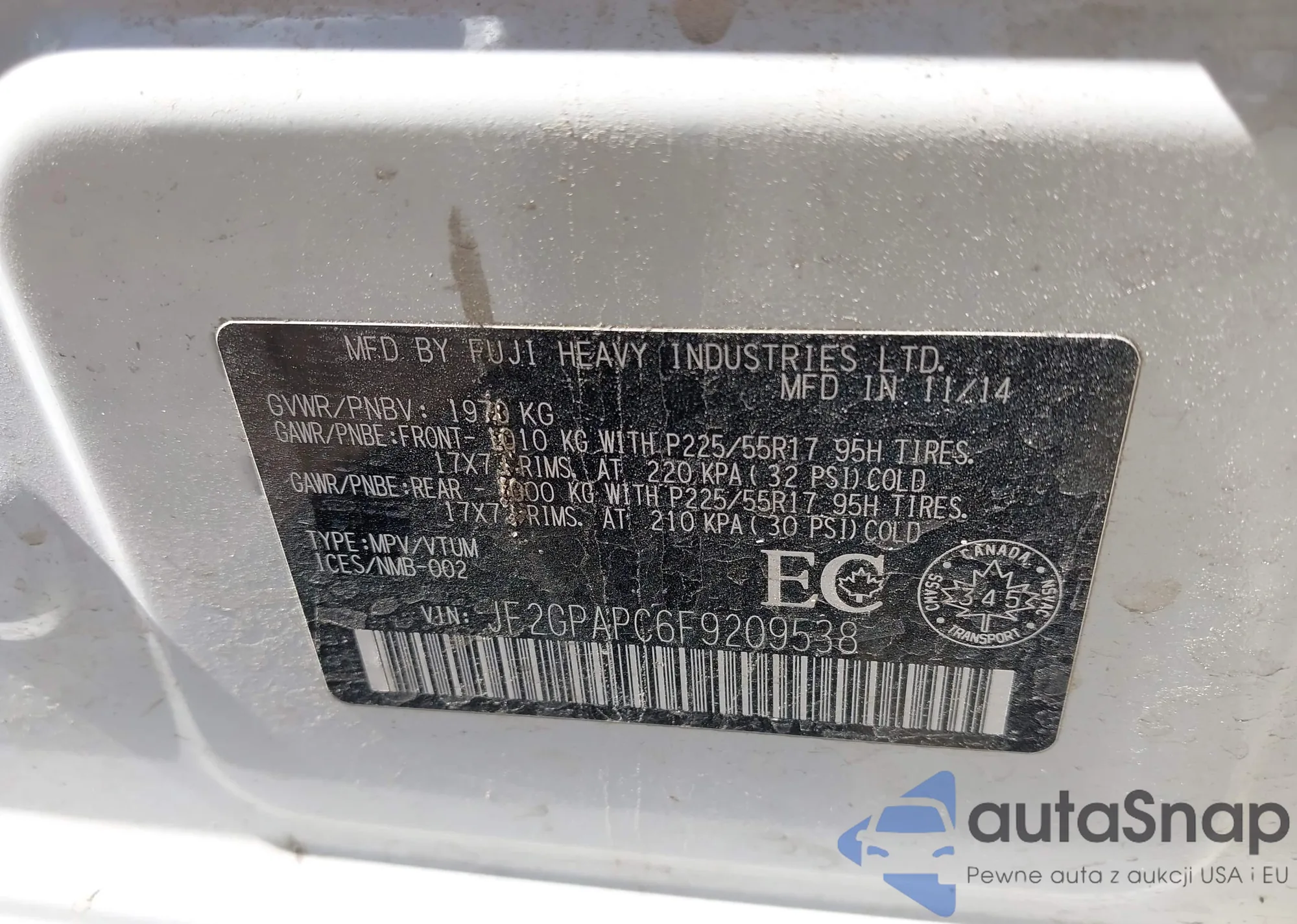 • VIN: JF2GPAPC6F9209538