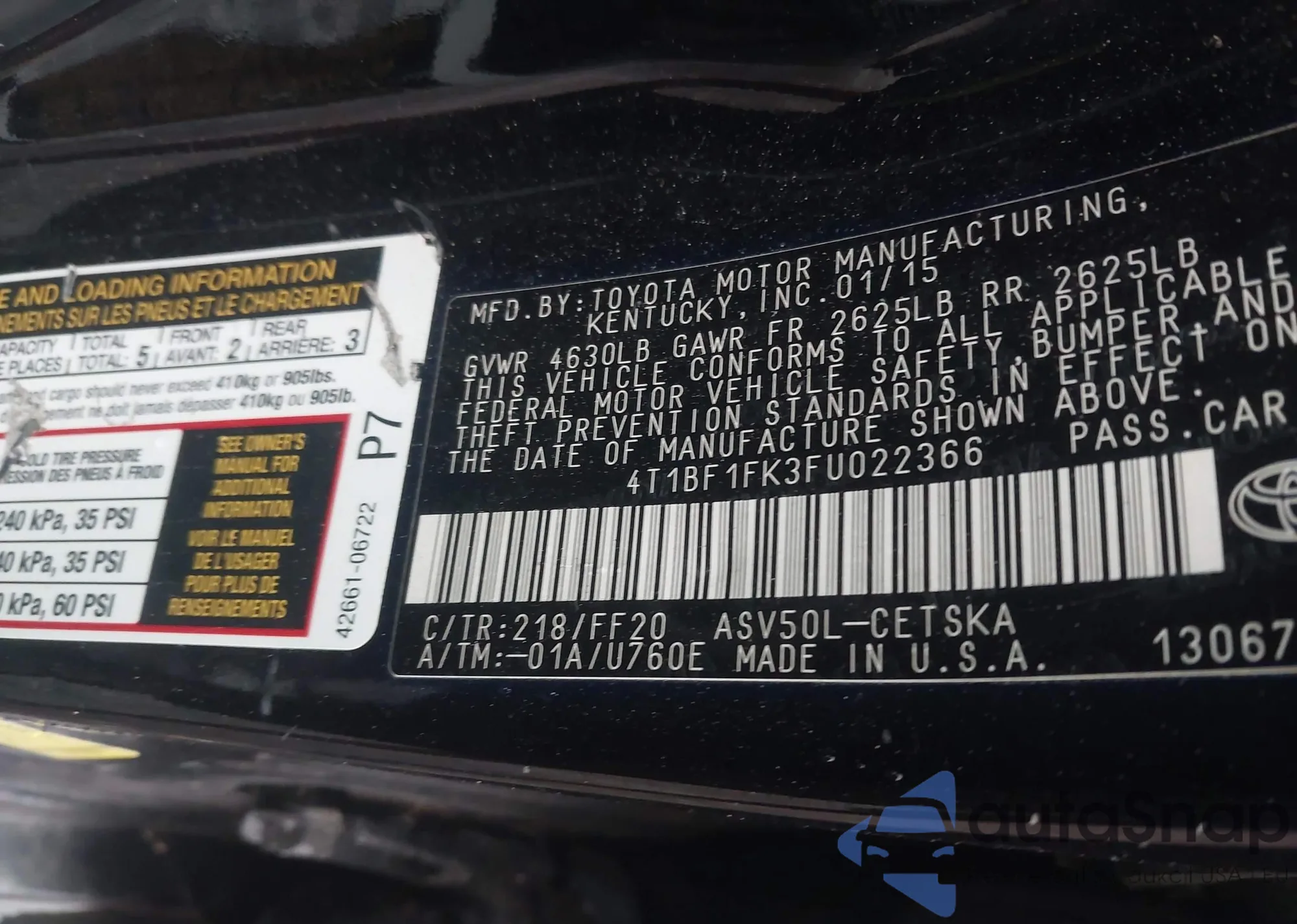 • VIN: 4T1BF1FK3FU022366