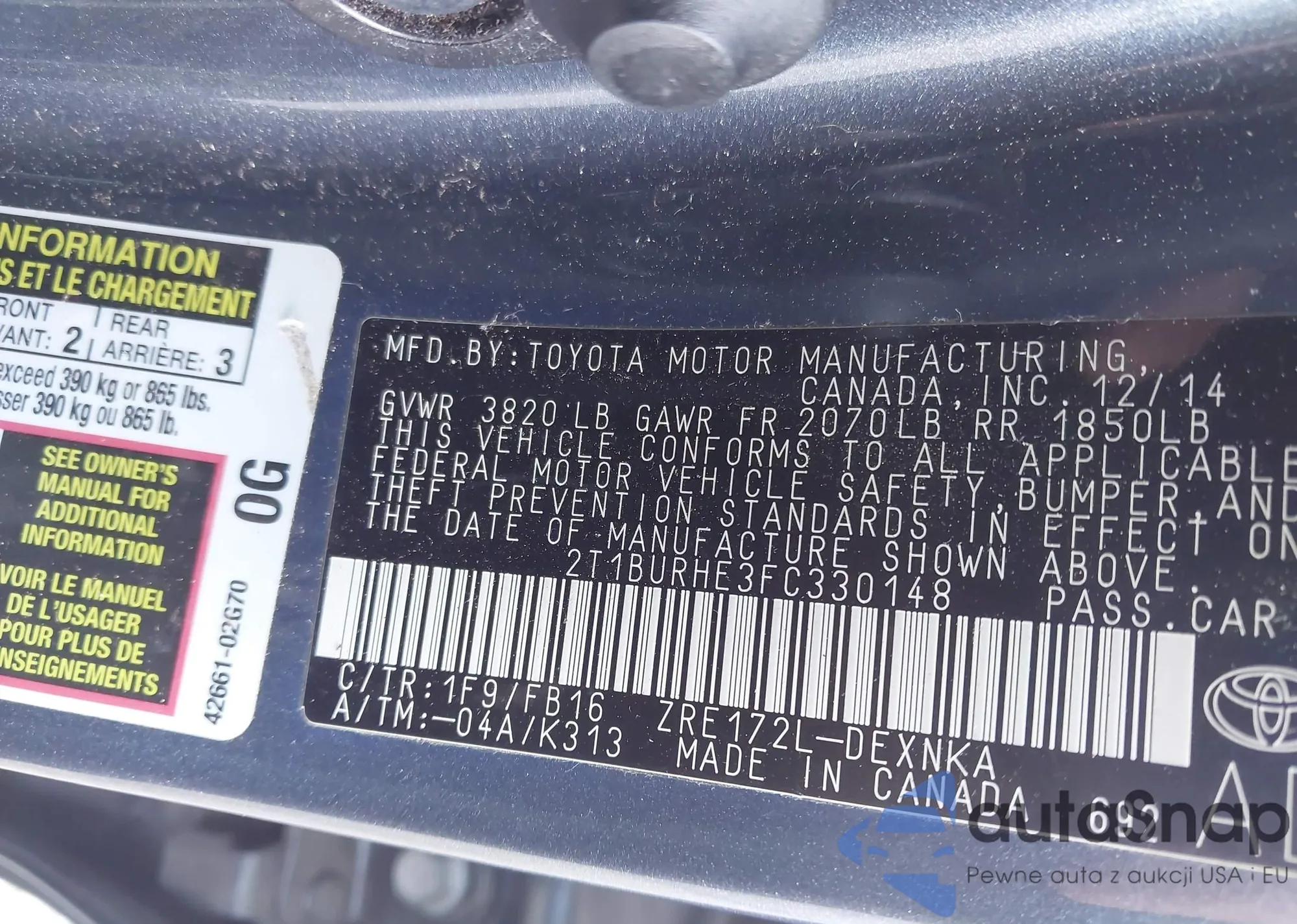 VIN: 2T1BURHE3FC330148