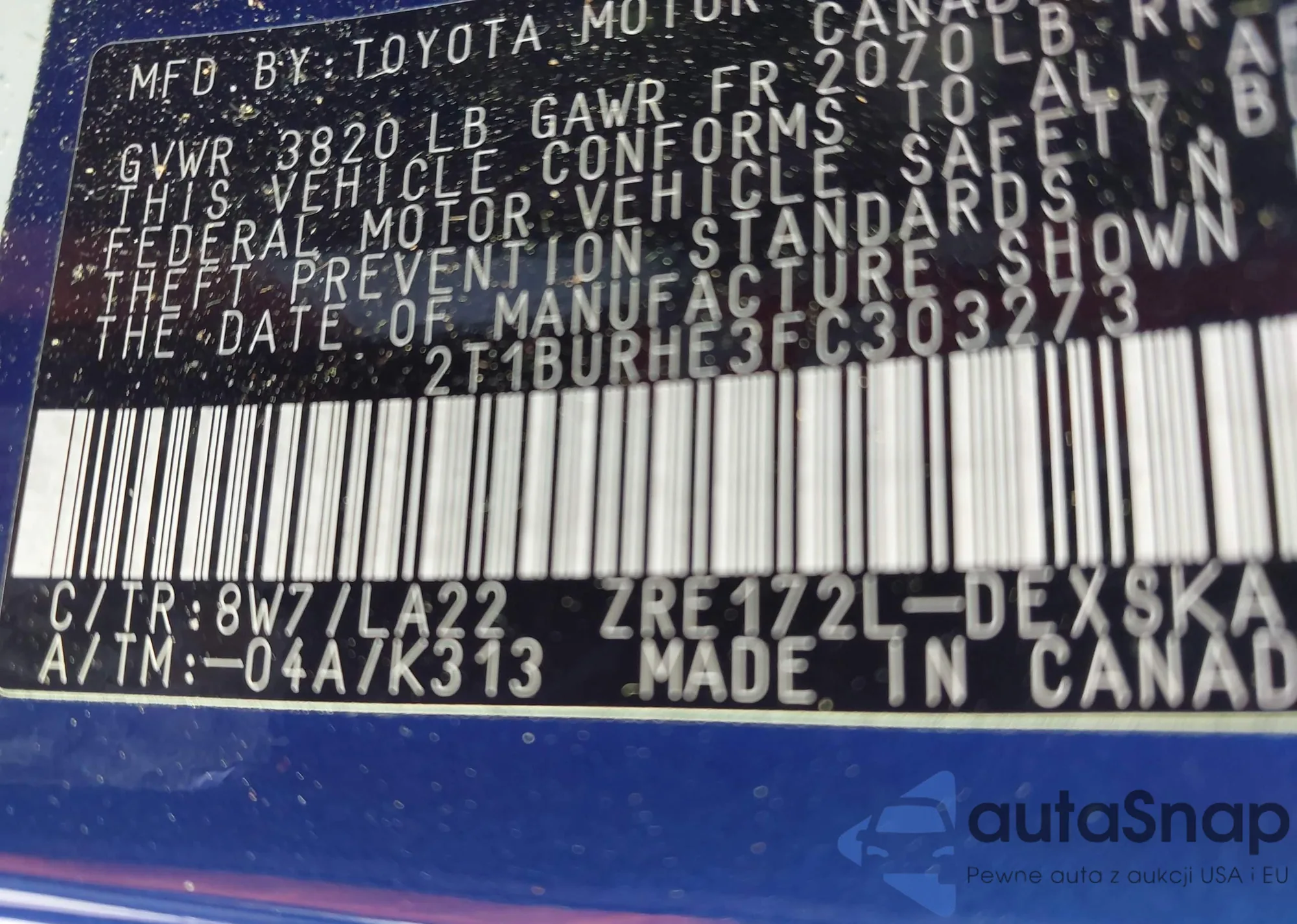 VIN: 2T1BURHE3FC303273