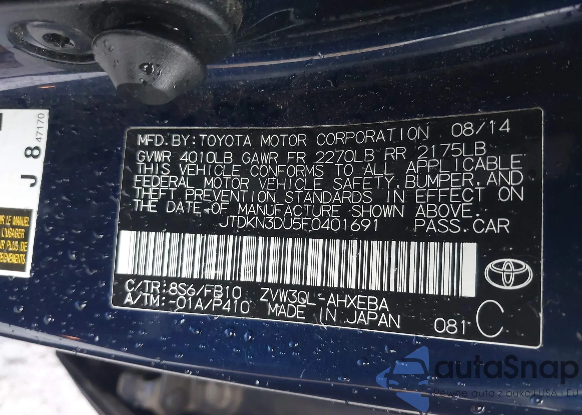 Samochód Toyota Prius 2015 (VIN JTDKN3DU5F0401691) nie był wcześniej licytowany. Dokumenty są czyste, przebieg odpowiada lub jest niższy niż średnia rynku. Sprzedaje go firma ubezpieczeniowa – polecamy zakup. Dostawa do portu zajmie ok. 6–8 tygodni.