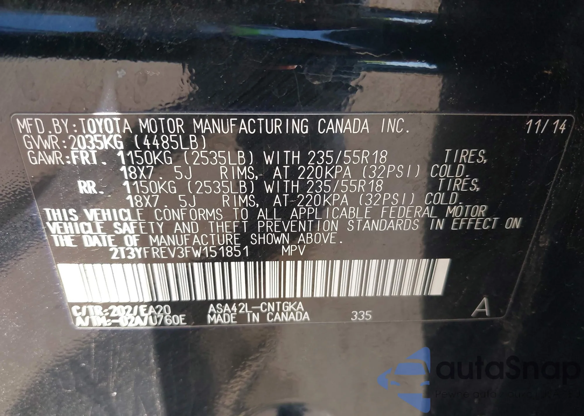 • VIN: 2T3YFREV3FW151851