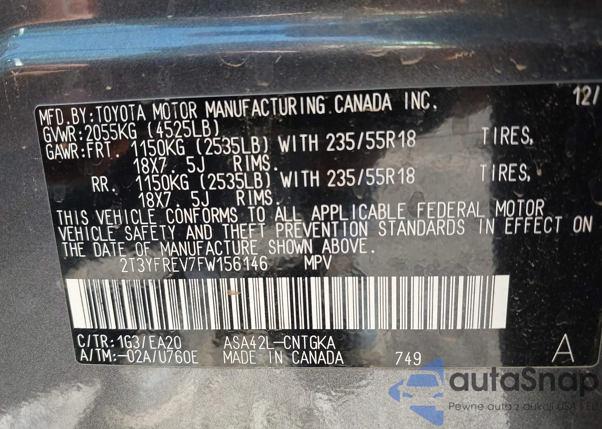 • VIN: 2T3YFREV7FW156146