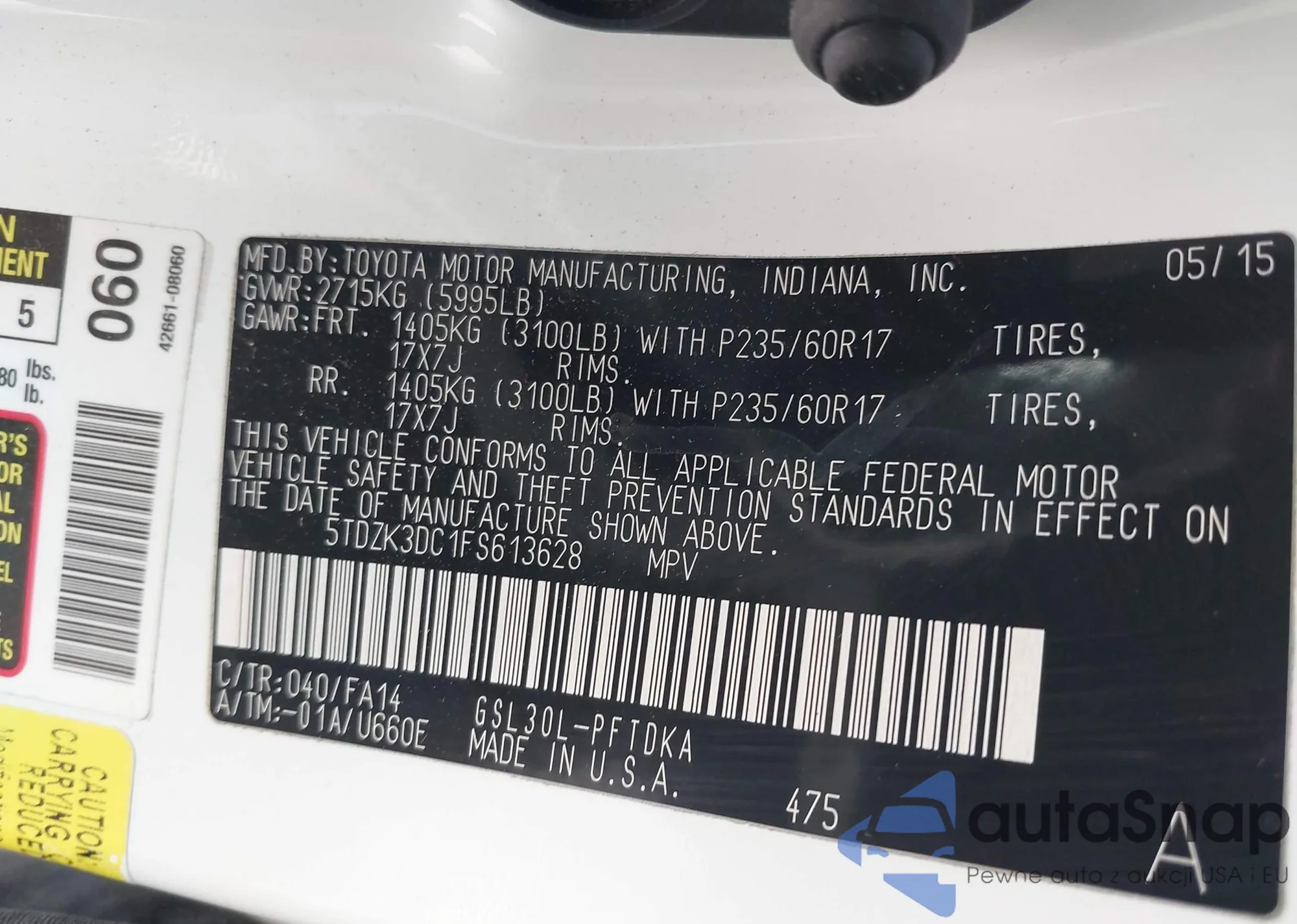 Samochód Toyota Sienna 2015 (VIN 5TDZK3DC1FS613628) nie był wcześniej licytowany. Dokumenty są czyste, przebieg odpowiada lub jest niższy niż średnia rynku. Sprzedaje go firma ubezpieczeniowa – polecamy zakup. Dostawa do portu zajmie ok. 6–8 tygodni.