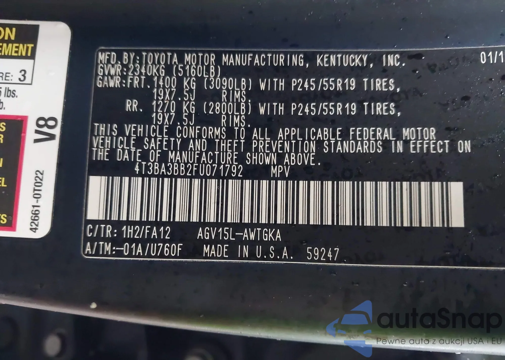 • VIN: 4T3BA3BB2FU071792