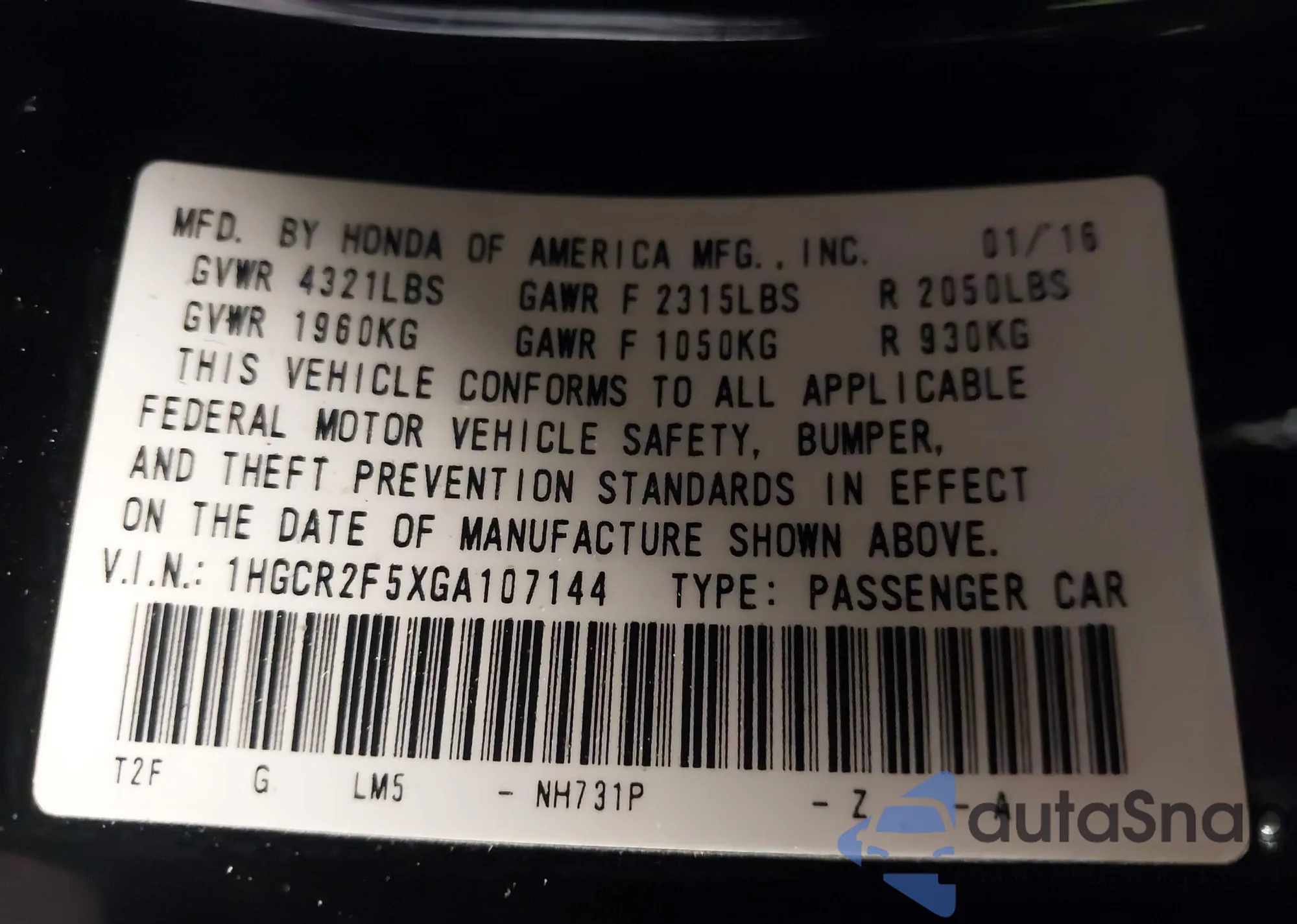 • VIN: 1HGCR2F5XGA107144