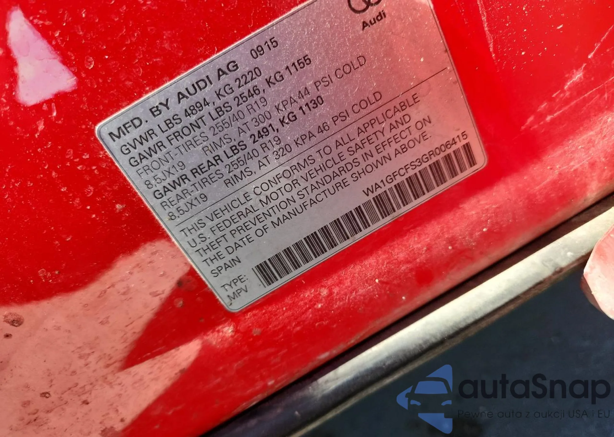 Samochód Audi Q3 2016 (VIN WA1GFCFS3GR006415) ma dokumenty uniemożliwiające rejestrację. Mogą pojawić się trudności przy eksporcie i rejestracji. Skontaktuj się z ekspertami AutaSnap w celu znalezienia alternatywy.
