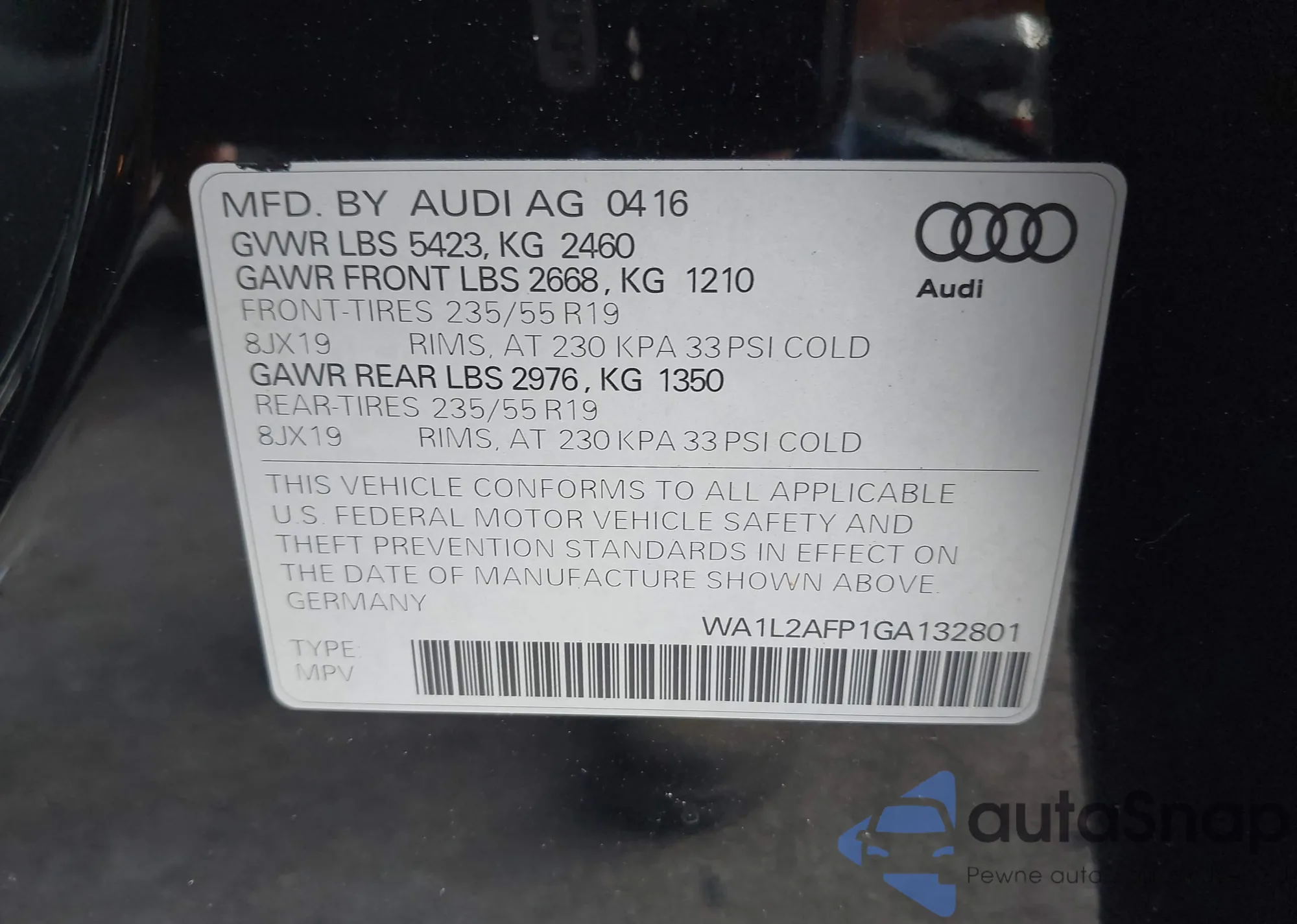 Samochód Audi Q5 2016 (VIN WA1L2AFP1GA132801) nie był wcześniej licytowany. Dokumenty są czyste, przebieg odpowiada lub jest niższy niż średnia rynku. Sprzedaje go firma ubezpieczeniowa – polecamy zakup. Dostawa do portu zajmie ok. 6–8 tygodni.
