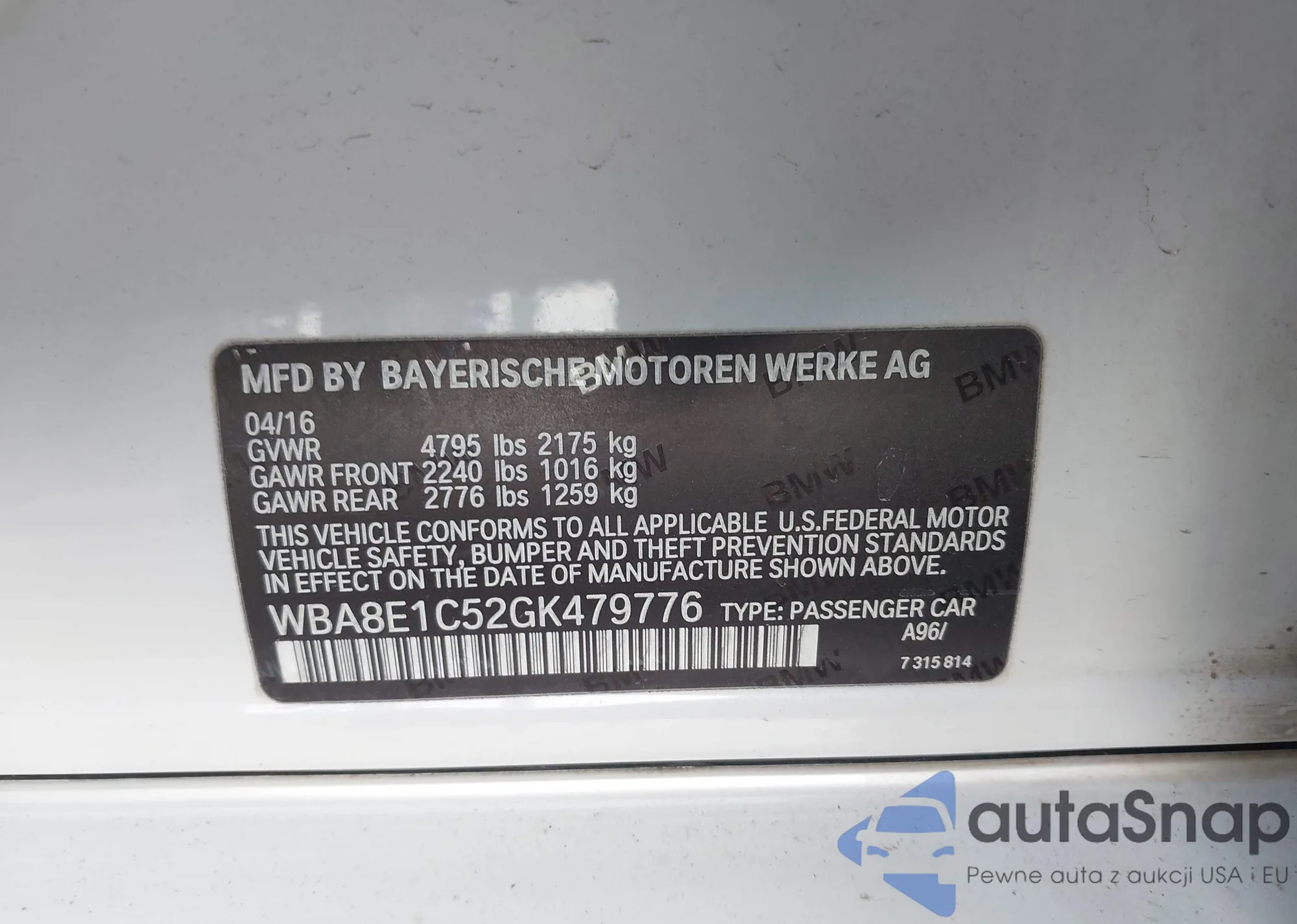 Samochód BMW 3er 2016 (VIN WBA8E1C52GK479776) nie był wcześniej licytowany. Dokumenty są czyste, przebieg odpowiada lub jest niższy niż średnia rynku. Sprzedaje go firma ubezpieczeniowa – polecamy zakup. Dostawa do portu zajmie ok. 6–8 tygodni.