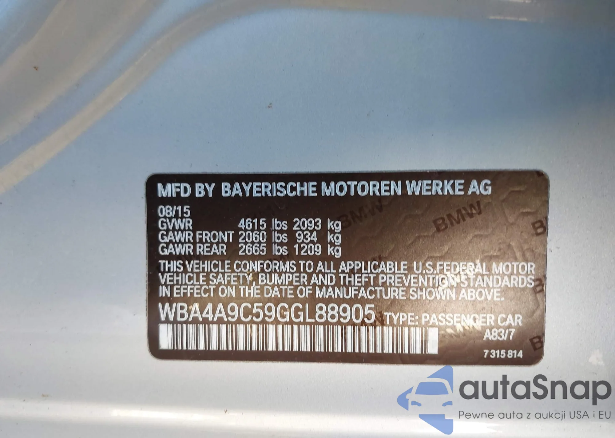 VIN: WBA4A9C59GGL88905