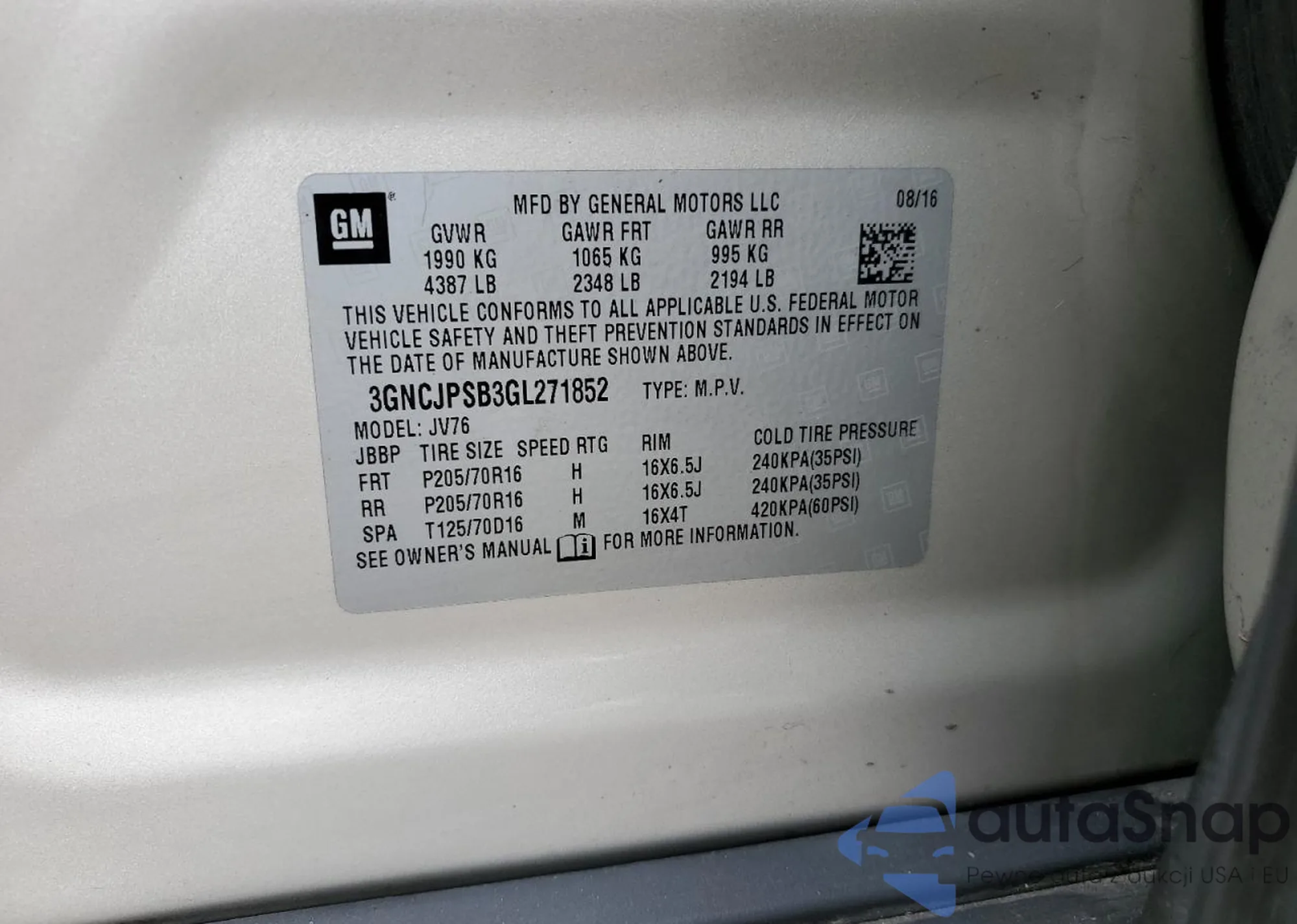Samochód Chevrolet Trax 2016 (VIN 3GNCJPSB3GL271852) sprzedaje go niezweryfikowany sprzedawca. Zalecamy raport Carfax i potwierdzenie możliwości rejestracji pojazdu przed zakupem.