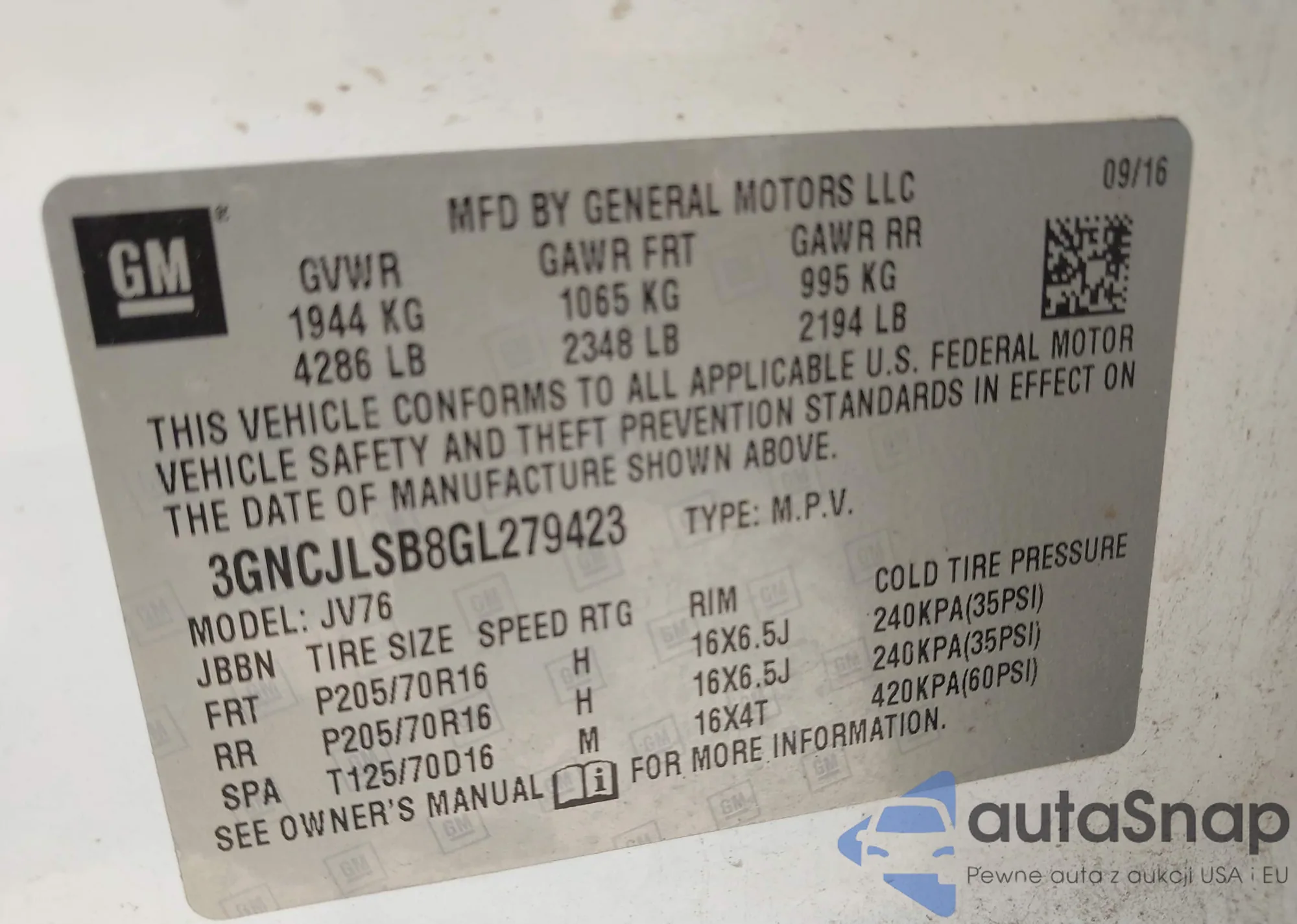 VIN: 3GNCJLSB8GL279423