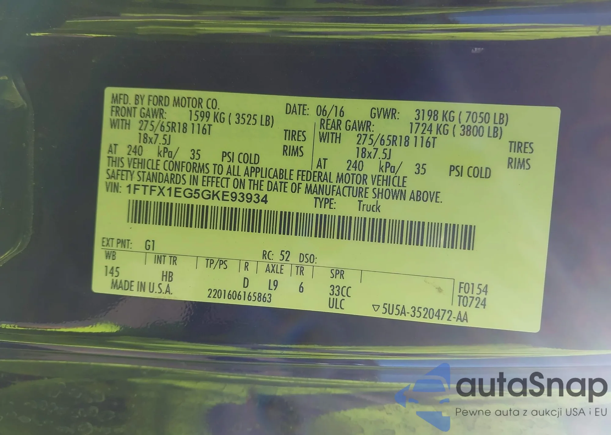 Samochód Ford F-150 2016 (VIN 1FTFX1EG5GKE93934) nie był wcześniej licytowany. Dokumenty są czyste, przebieg odpowiada lub jest niższy niż średnia rynku. Sprzedaje go firma ubezpieczeniowa – polecamy zakup. Dostawa do portu zajmie ok. 6–8 tygodni.