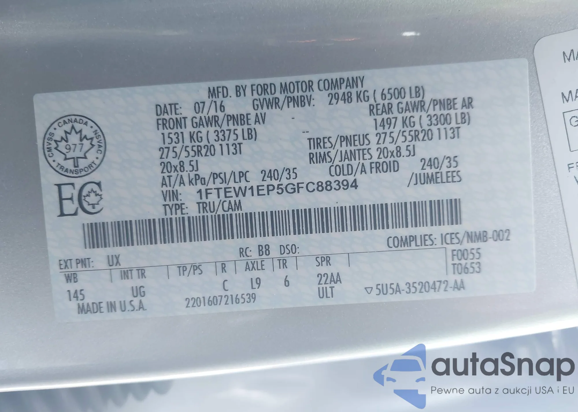 Samochód Ford F-150 2016 (VIN 1FTEW1EP5GFC88394) nie był wcześniej licytowany. Dokumenty są czyste, przebieg odpowiada lub jest niższy niż średnia rynku. Sprzedaje go firma ubezpieczeniowa – polecamy zakup. Dostawa do portu zajmie ok. 6–8 tygodni.