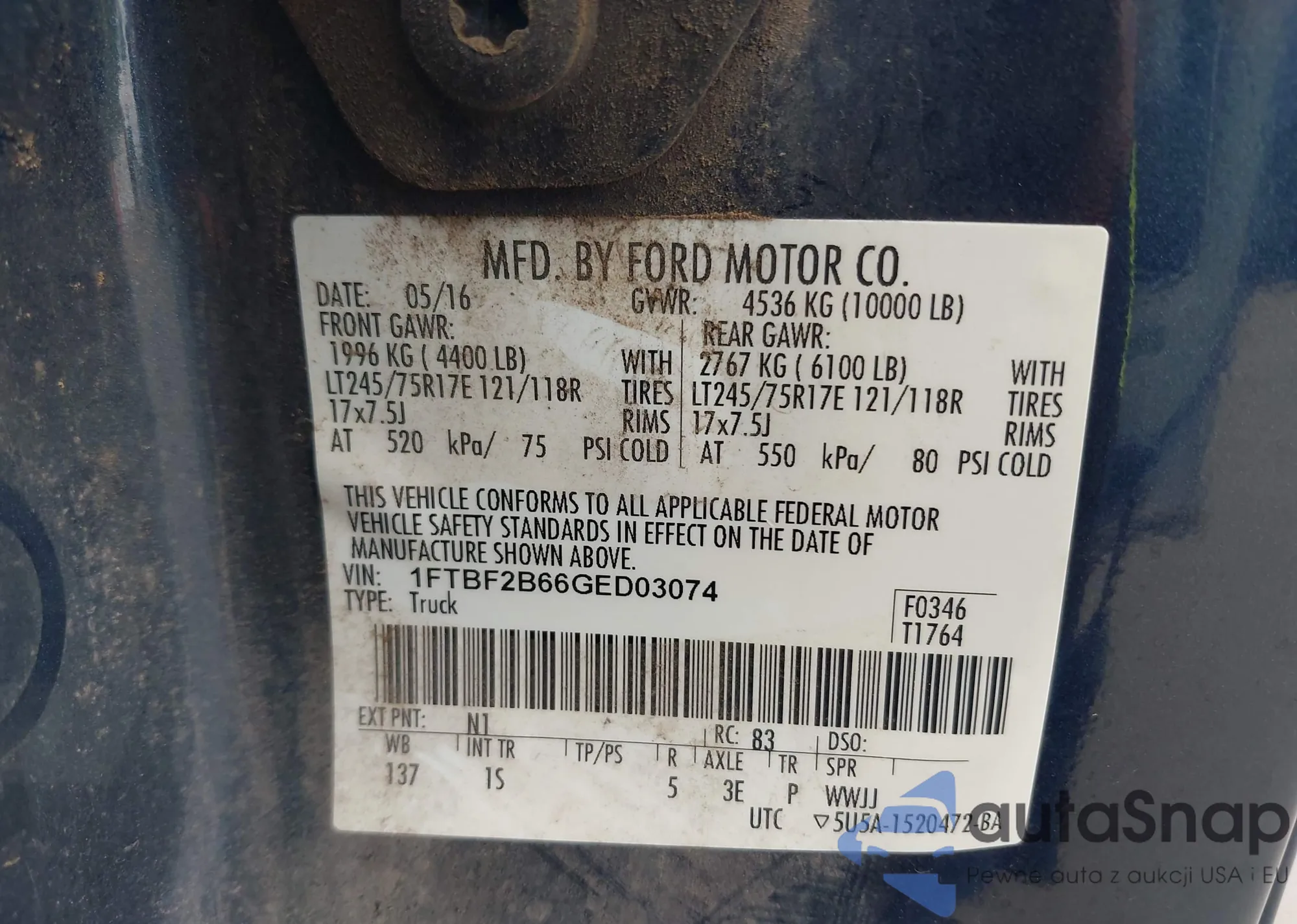 Samochód Ford F250 2016 (VIN 1FTBF2B66GED03074) ma dokumenty uniemożliwiające rejestrację. Mogą pojawić się trudności przy eksporcie i rejestracji. Skontaktuj się z ekspertami AutaSnap w celu znalezienia alternatywy.