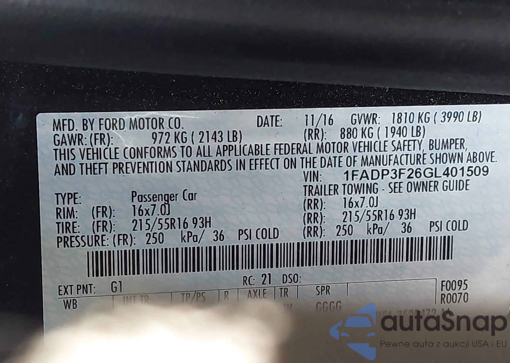 VIN: 1FADP3F26GL401509