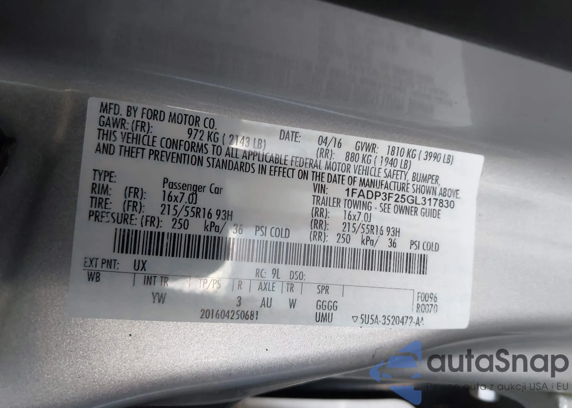 VIN: 1FADP3F25GL317830