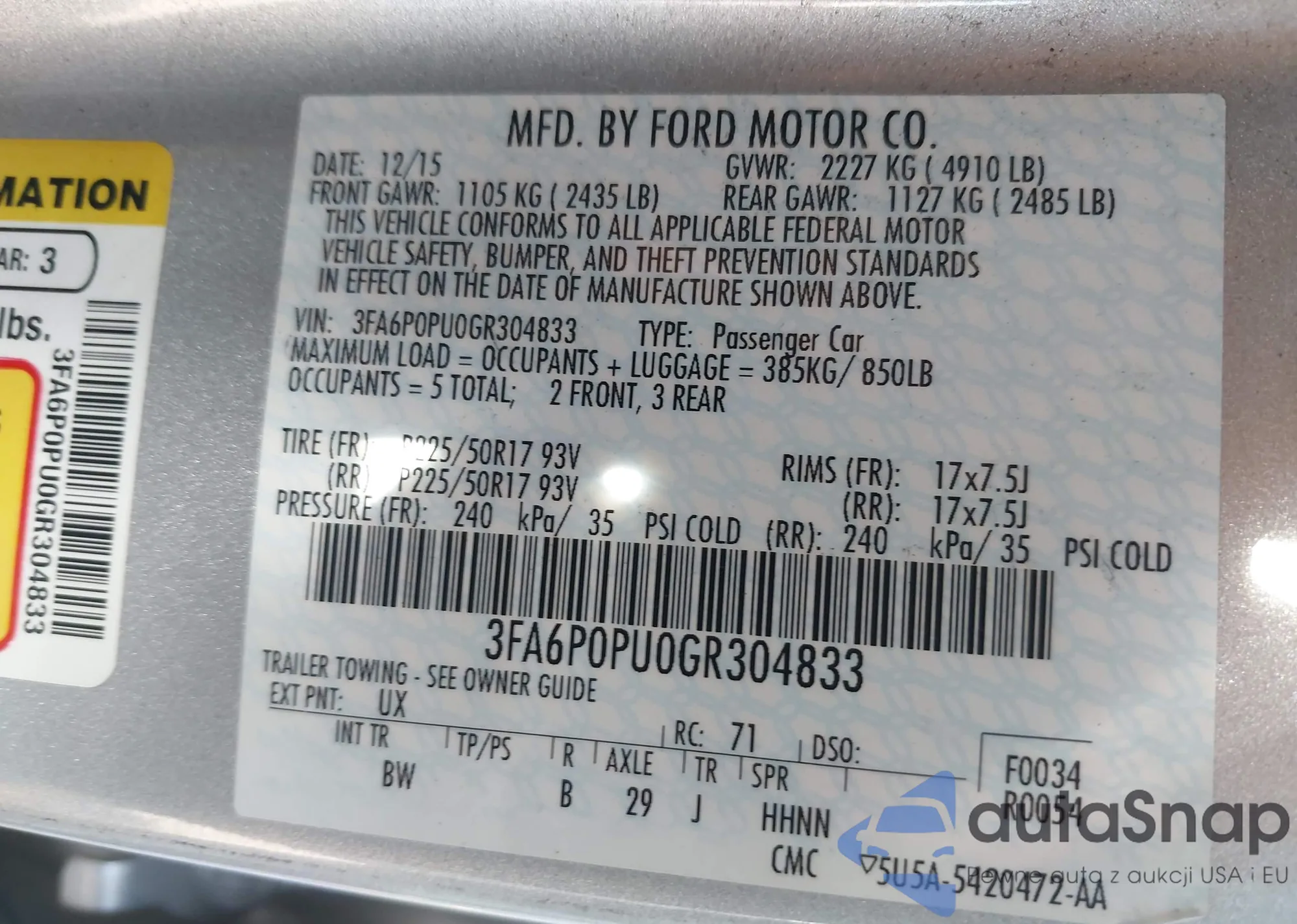 Samochód Ford Fusion 2016 (VIN 3FA6P0PU0GR304833) nie był wcześniej licytowany. Dokumenty są czyste, przebieg odpowiada lub jest niższy niż średnia rynku. Sprzedaje go firma ubezpieczeniowa – polecamy zakup. Dostawa do portu zajmie ok. 6–8 tygodni.