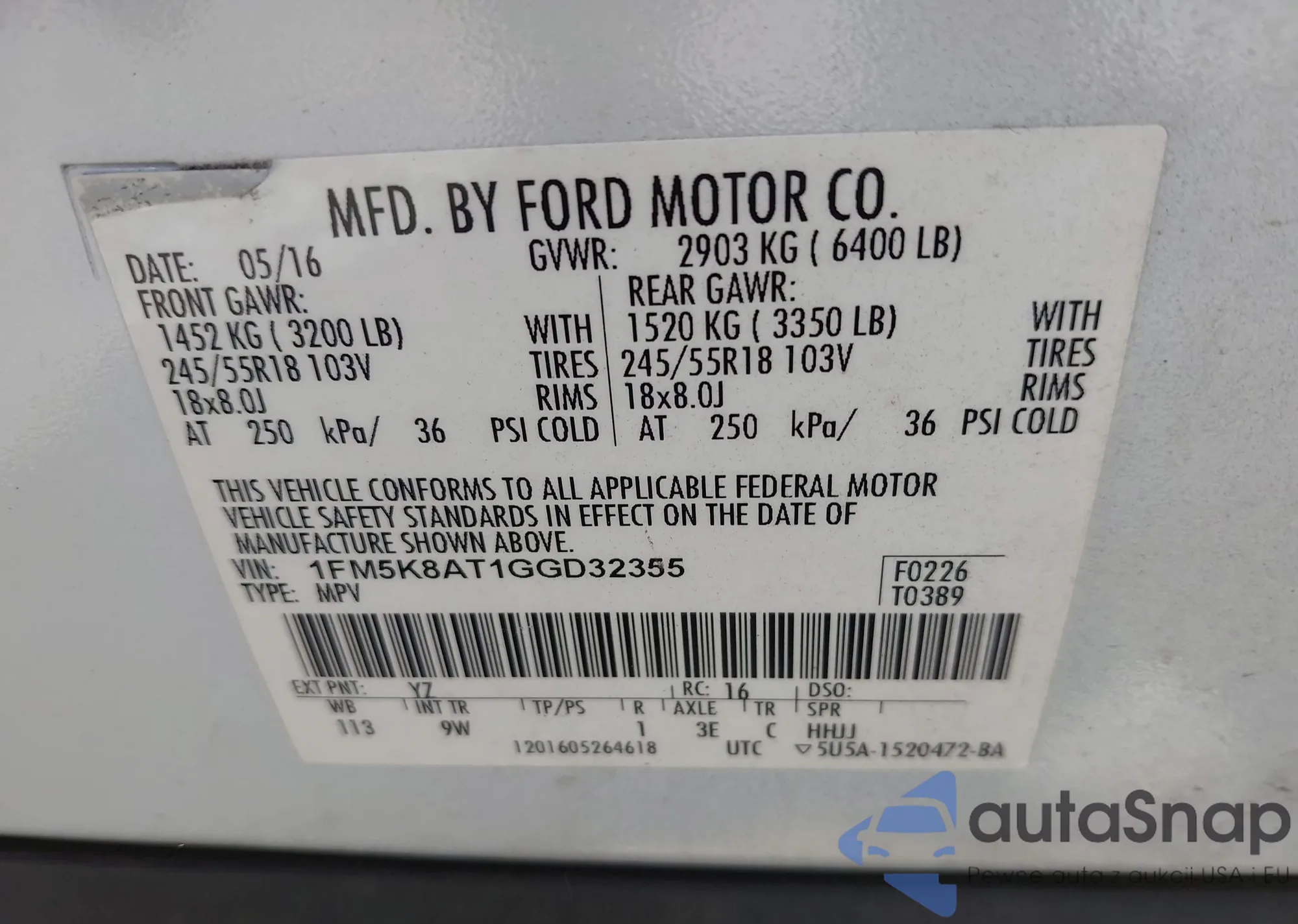 VIN: 1FM5K8AT1GGD32355