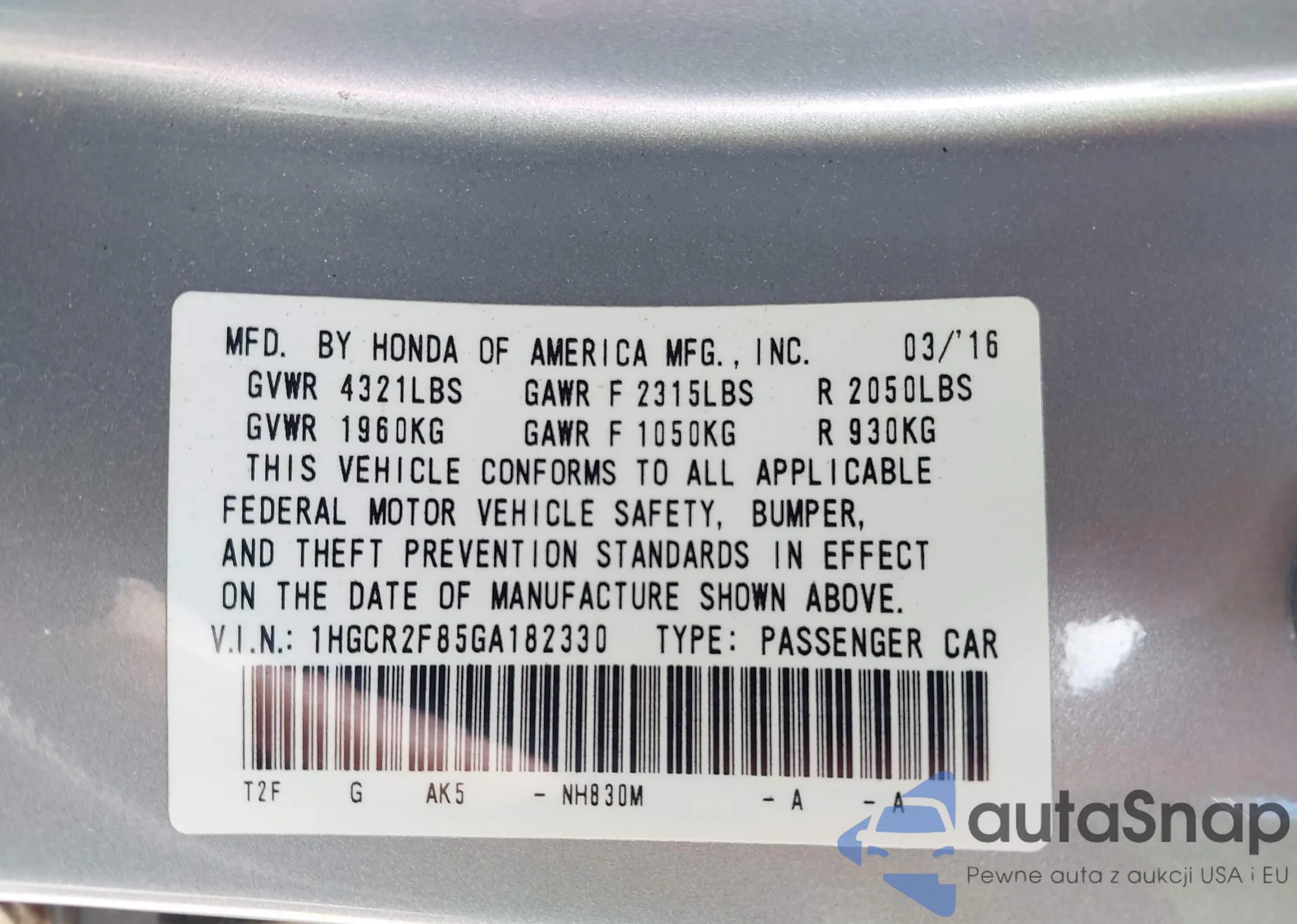 VIN: 1HGCR2F85GA182330
