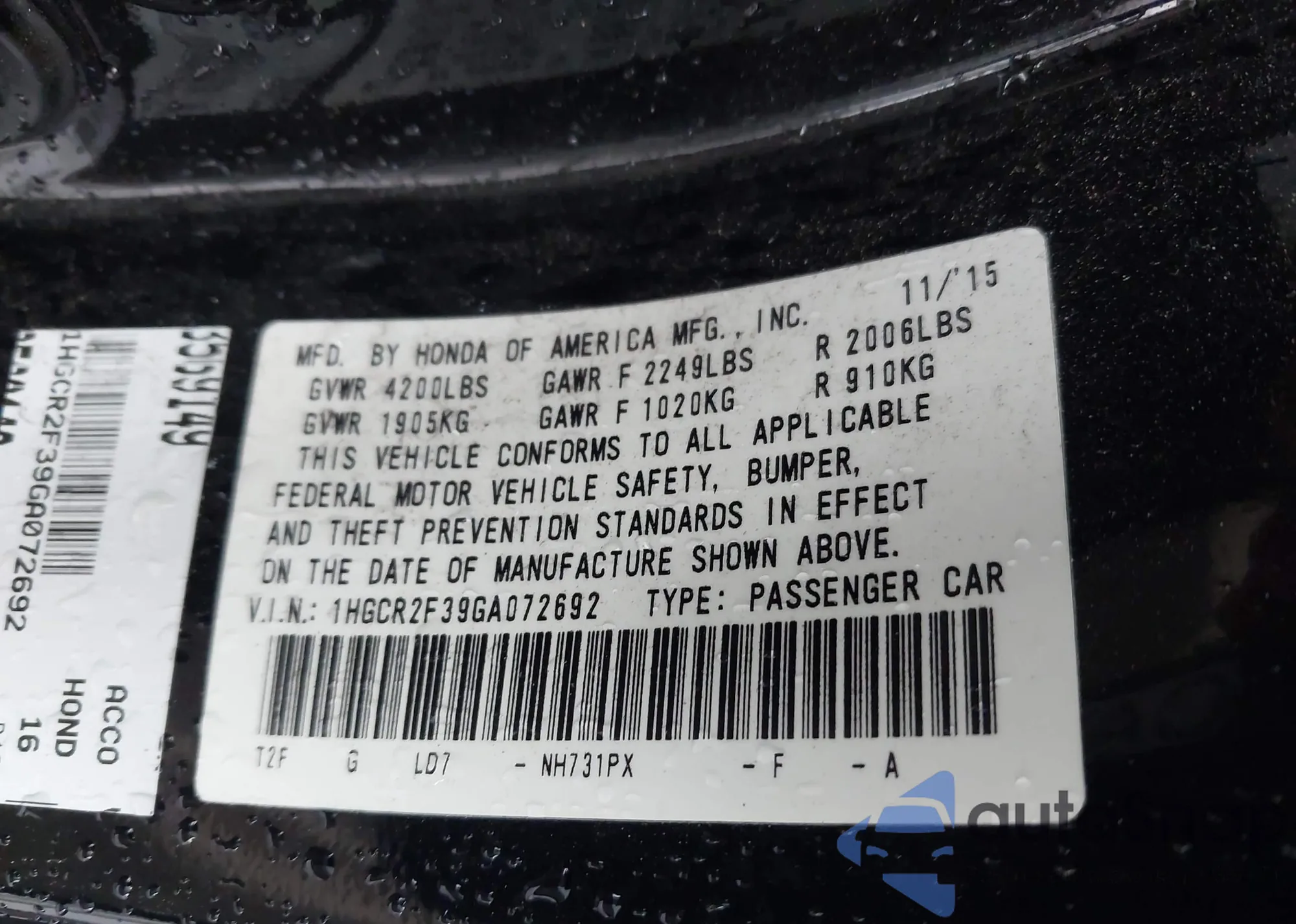 VIN: 1HGCR2F39GA072692