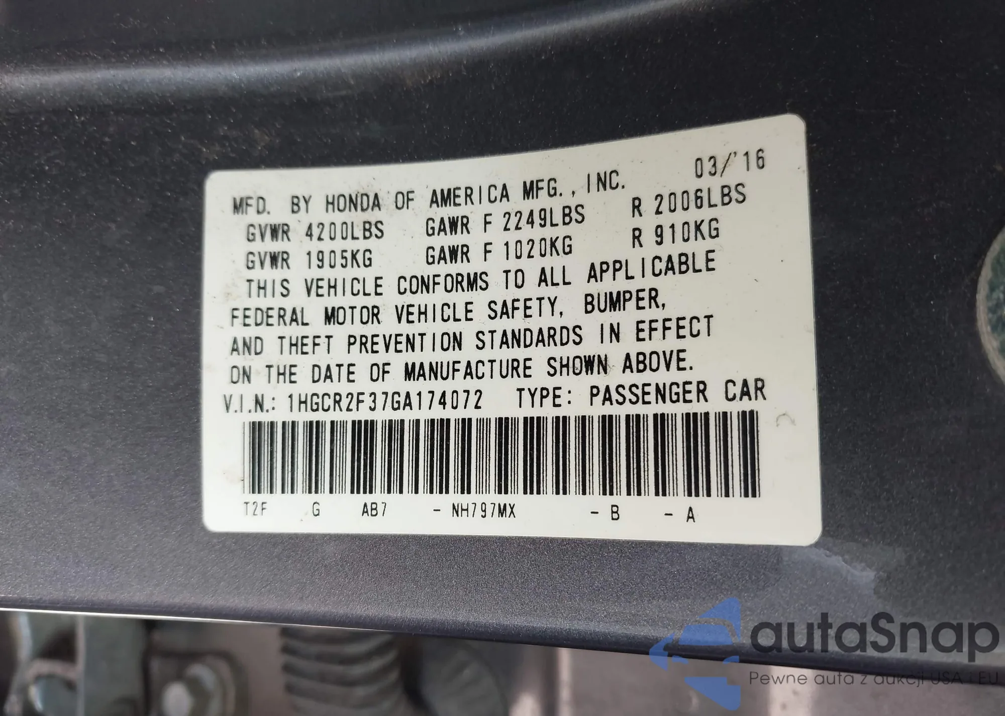 • VIN: 1HGCR2F37GA174072