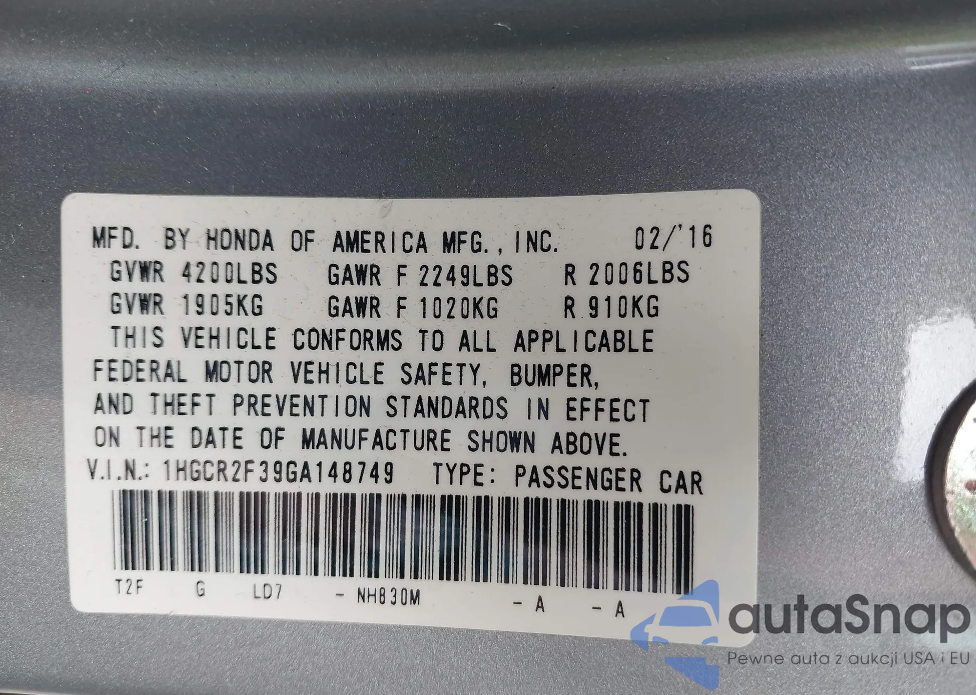 • VIN: 1HGCR2F39GA148749