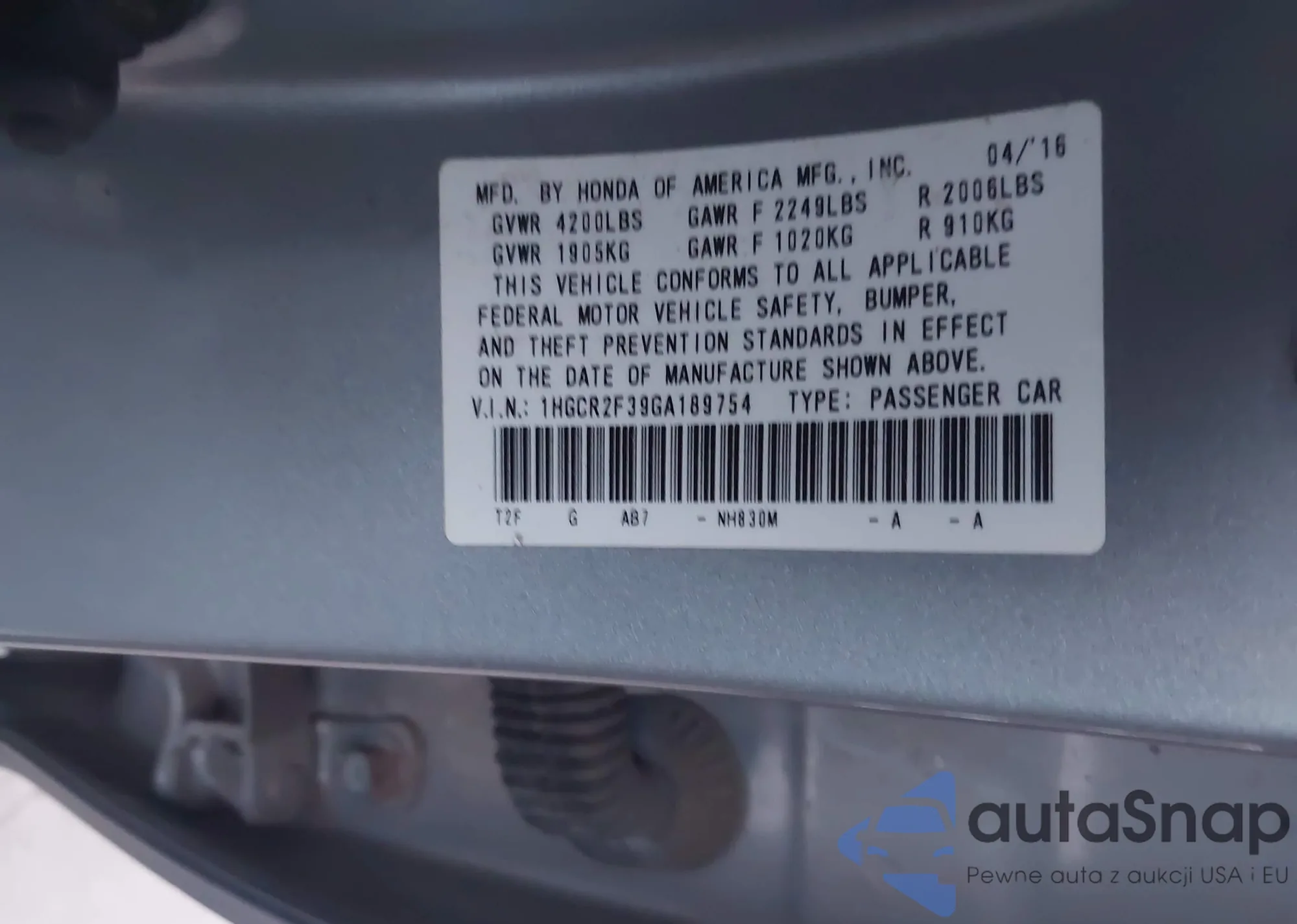 VIN: 1HGCR2F39GA189754