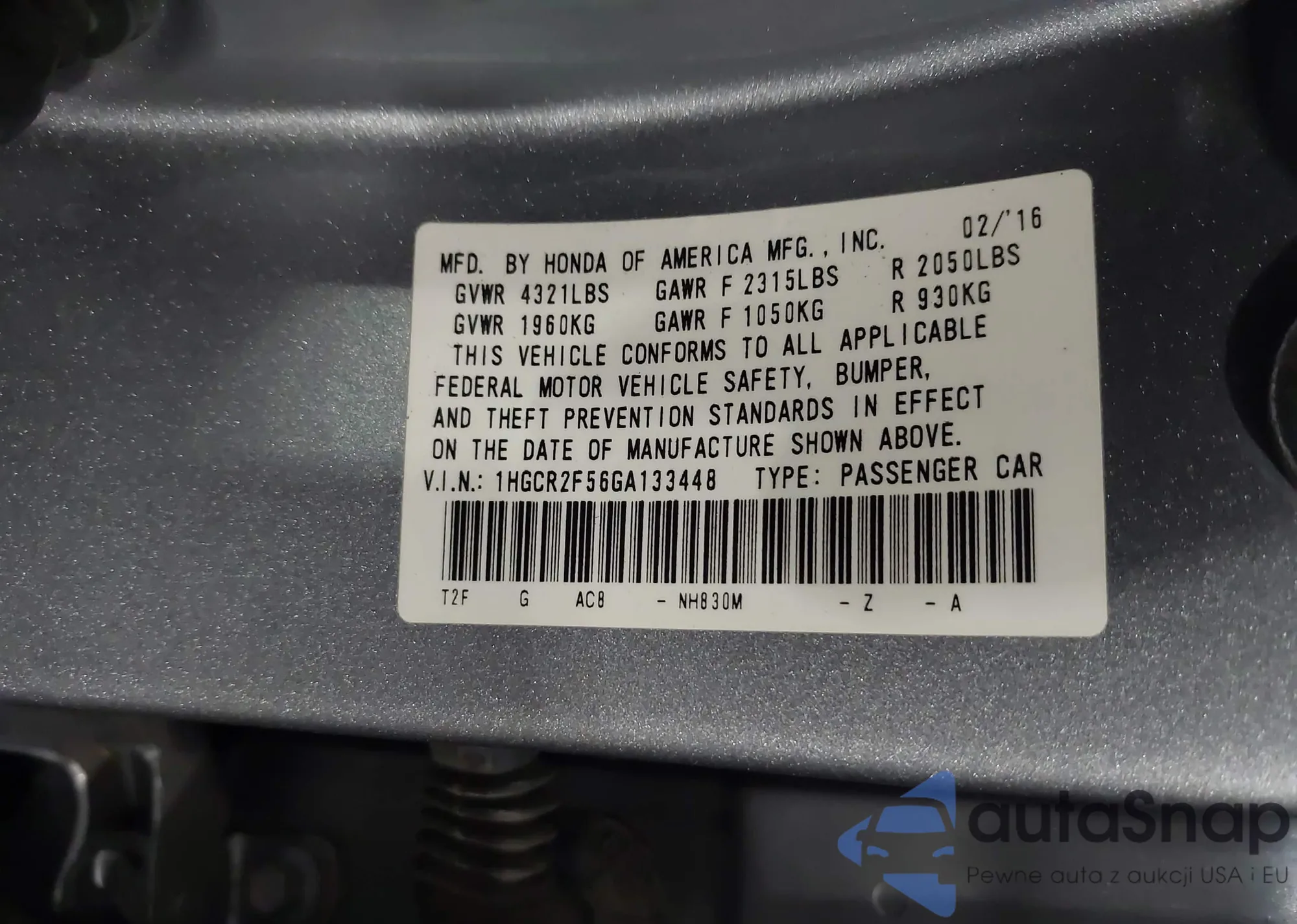 VIN: 1HGCR2F56GA133448