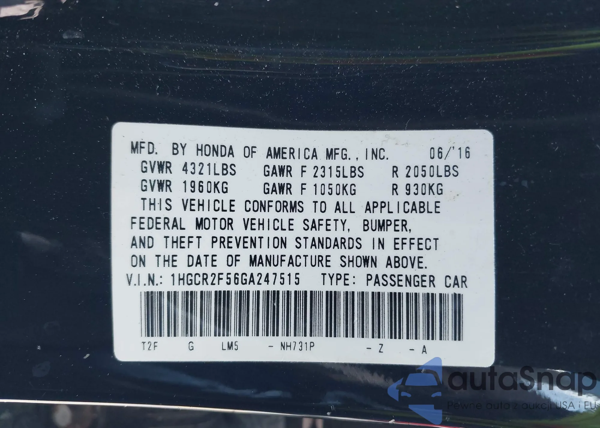 Samochód Honda Accord 2016 (VIN 1HGCR2F56GA247515) nie był wcześniej licytowany. Dokumenty są czyste, przebieg odpowiada lub jest niższy niż średnia rynku. Sprzedaje go firma ubezpieczeniowa – polecamy zakup. Dostawa do portu zajmie ok. 6–8 tygodni.