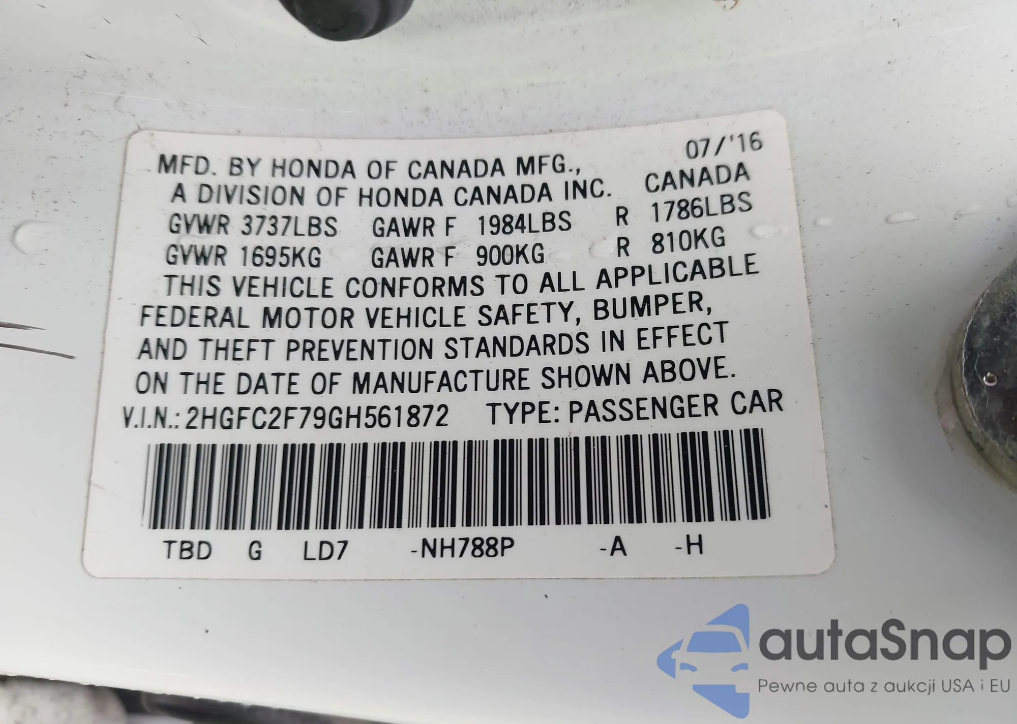VIN: 2HGFC2F79GH561872