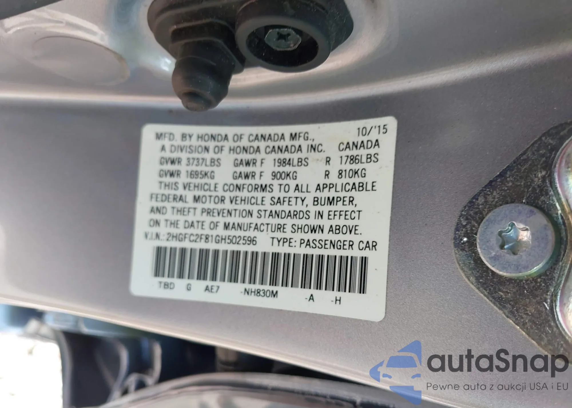 VIN: 2HGFC2F81GH502596