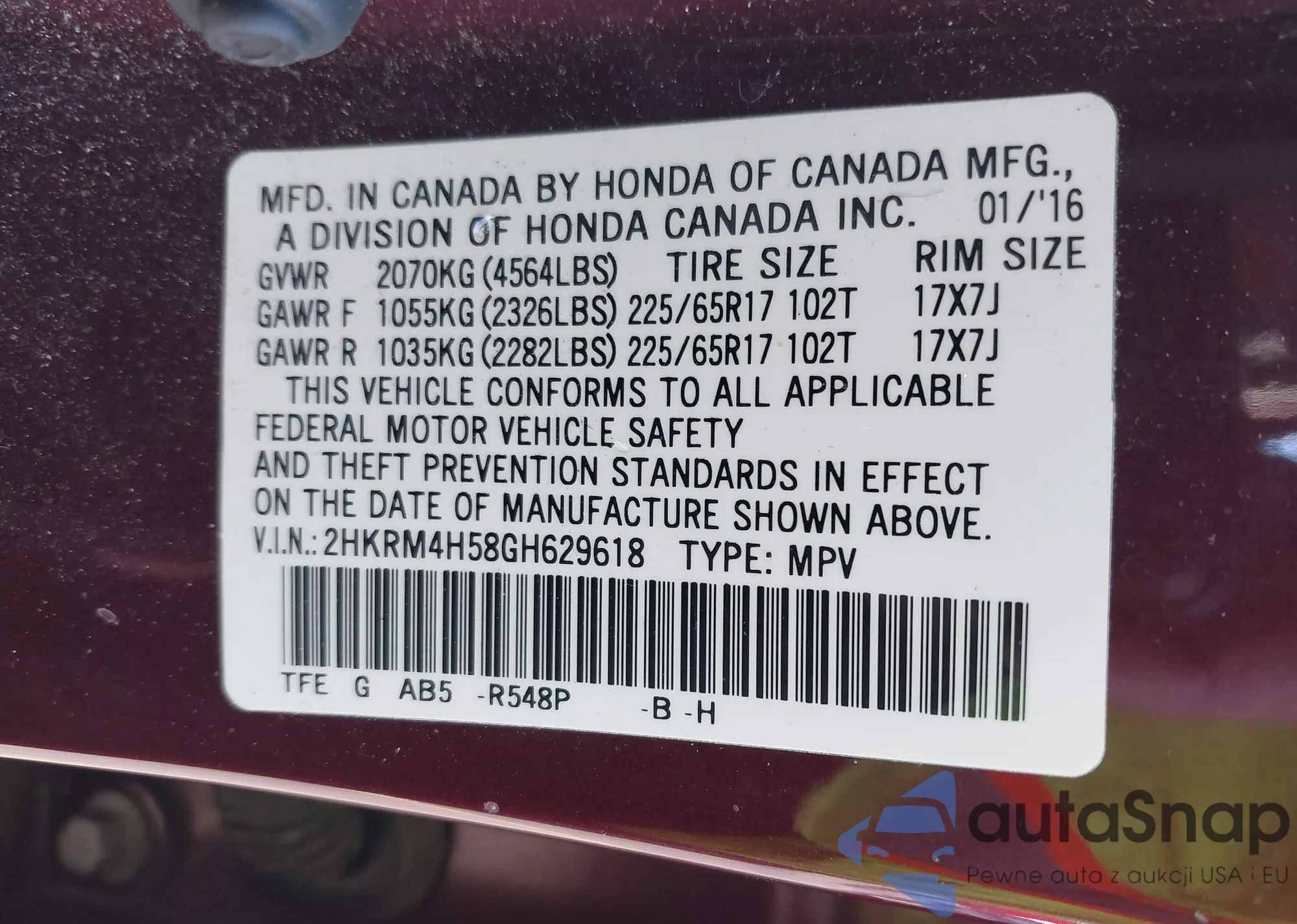 VIN: 2HKRM4H58GH629618