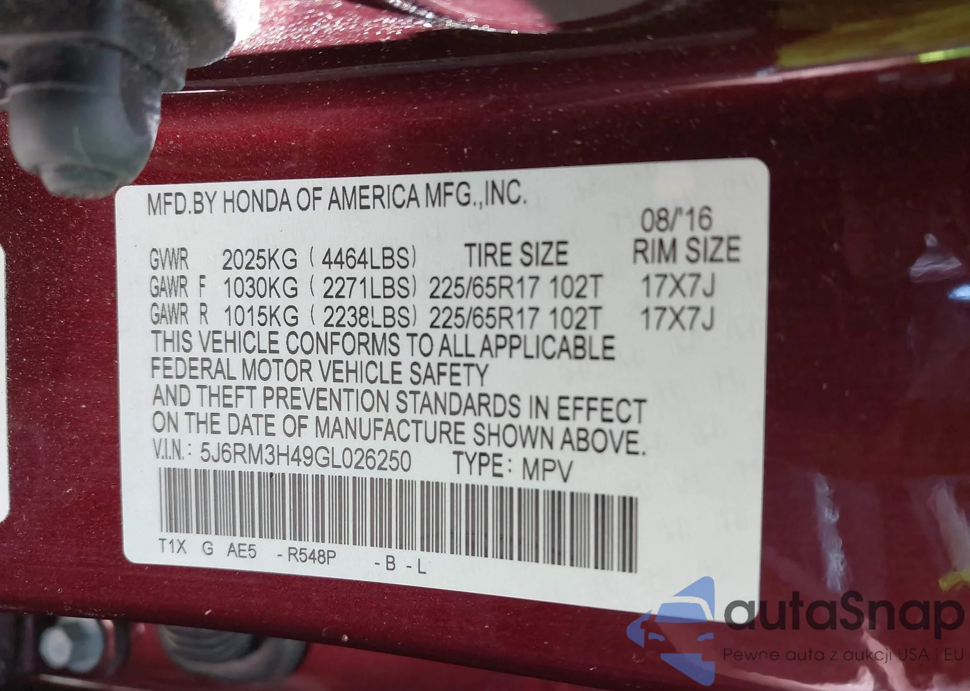 VIN: 5J6RM3H49GL026250