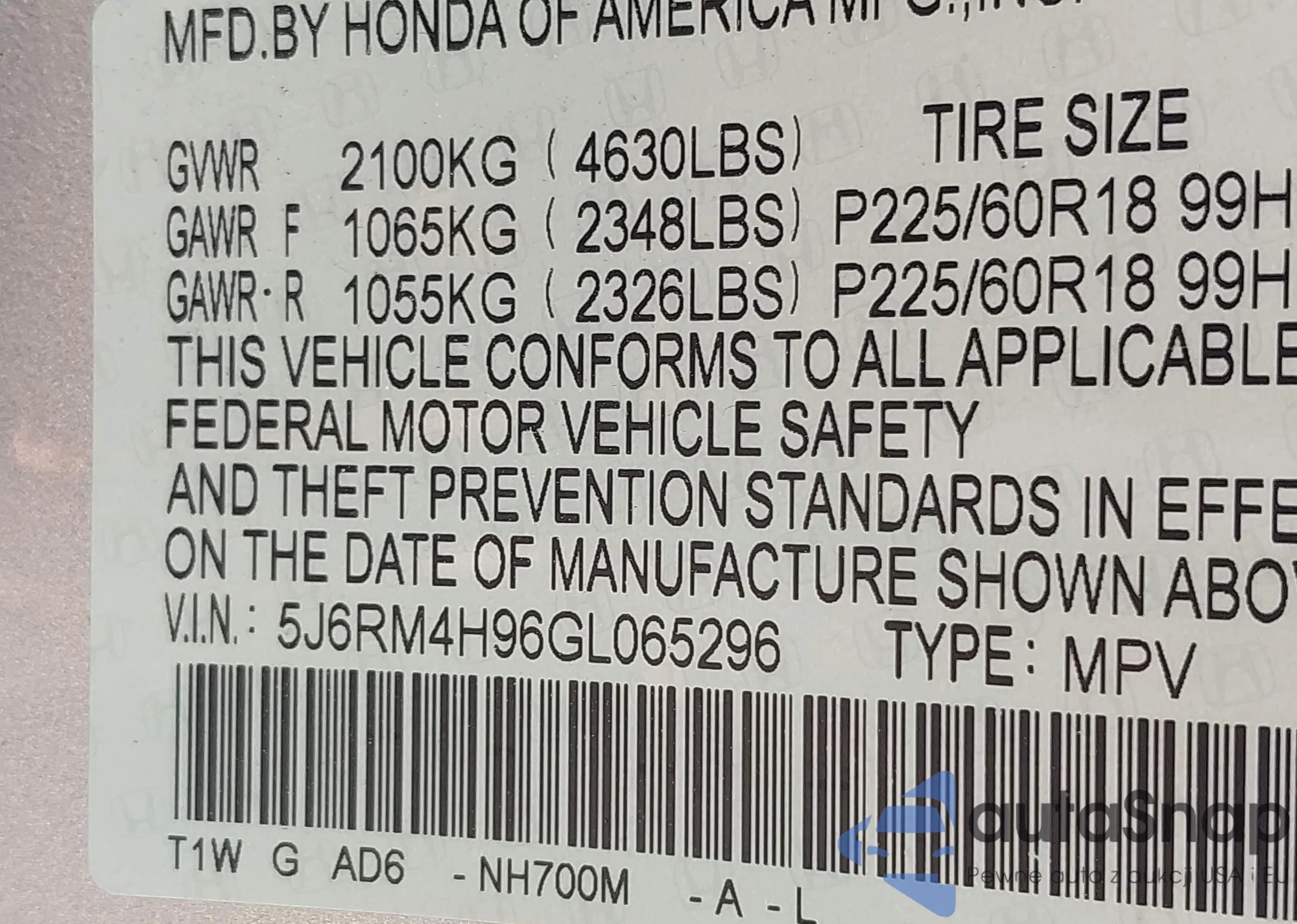 VIN: 5J6RM4H96GL065296