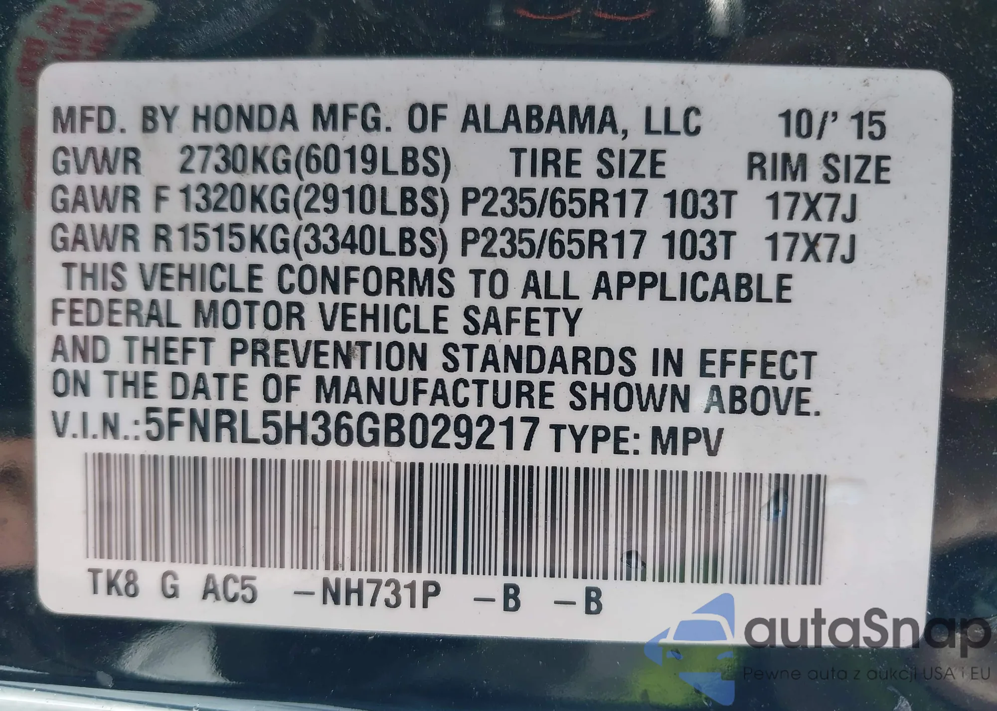 Samochód Honda Odyssey 2016 (VIN 5FNRL5H36GB029217) nie był wcześniej licytowany. Dokumenty są czyste, przebieg odpowiada lub jest niższy niż średnia rynku. Sprzedaje go firma ubezpieczeniowa – polecamy zakup. Dostawa do portu zajmie ok. 6–8 tygodni.