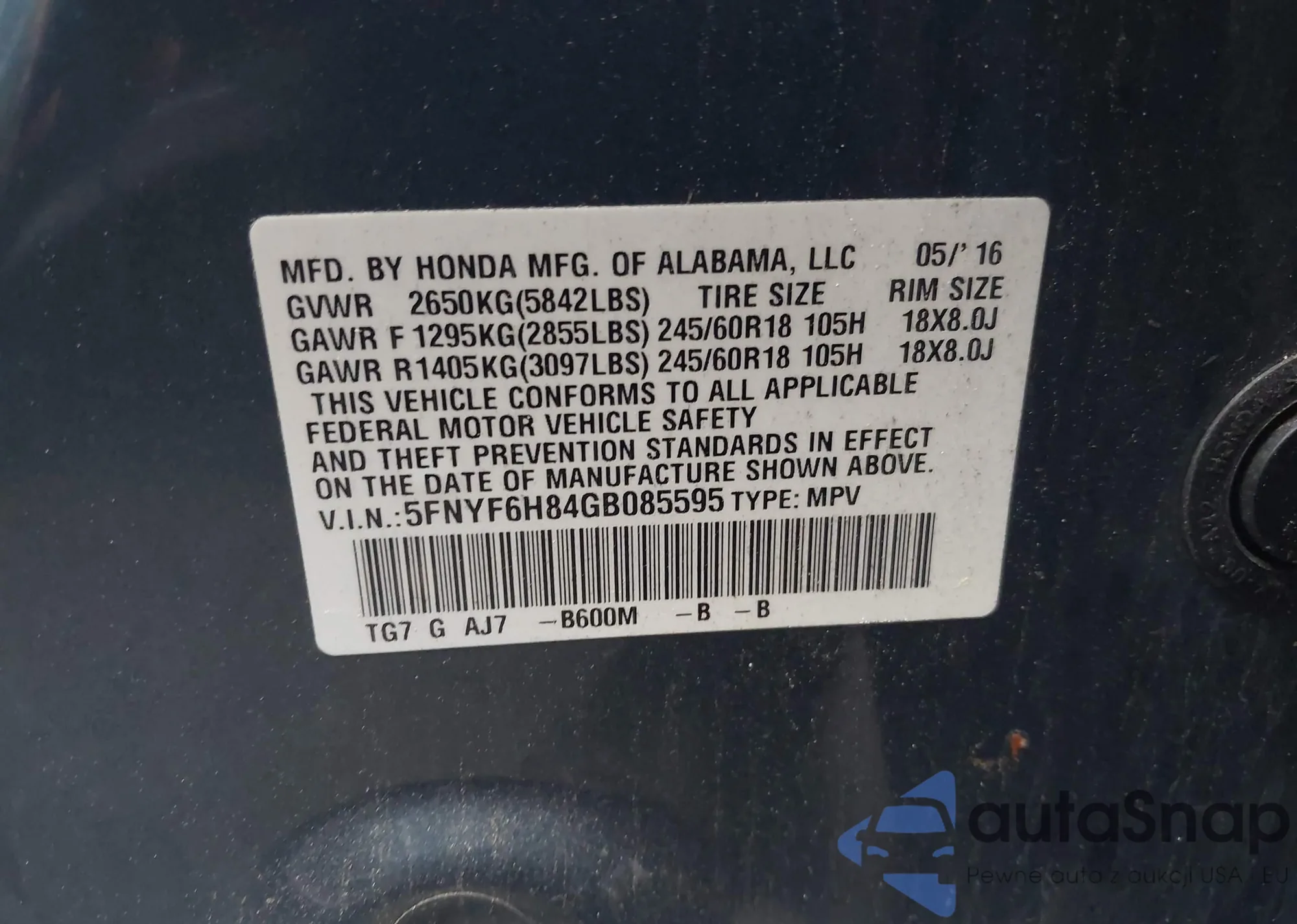 VIN: 5FNYF6H84GB085595