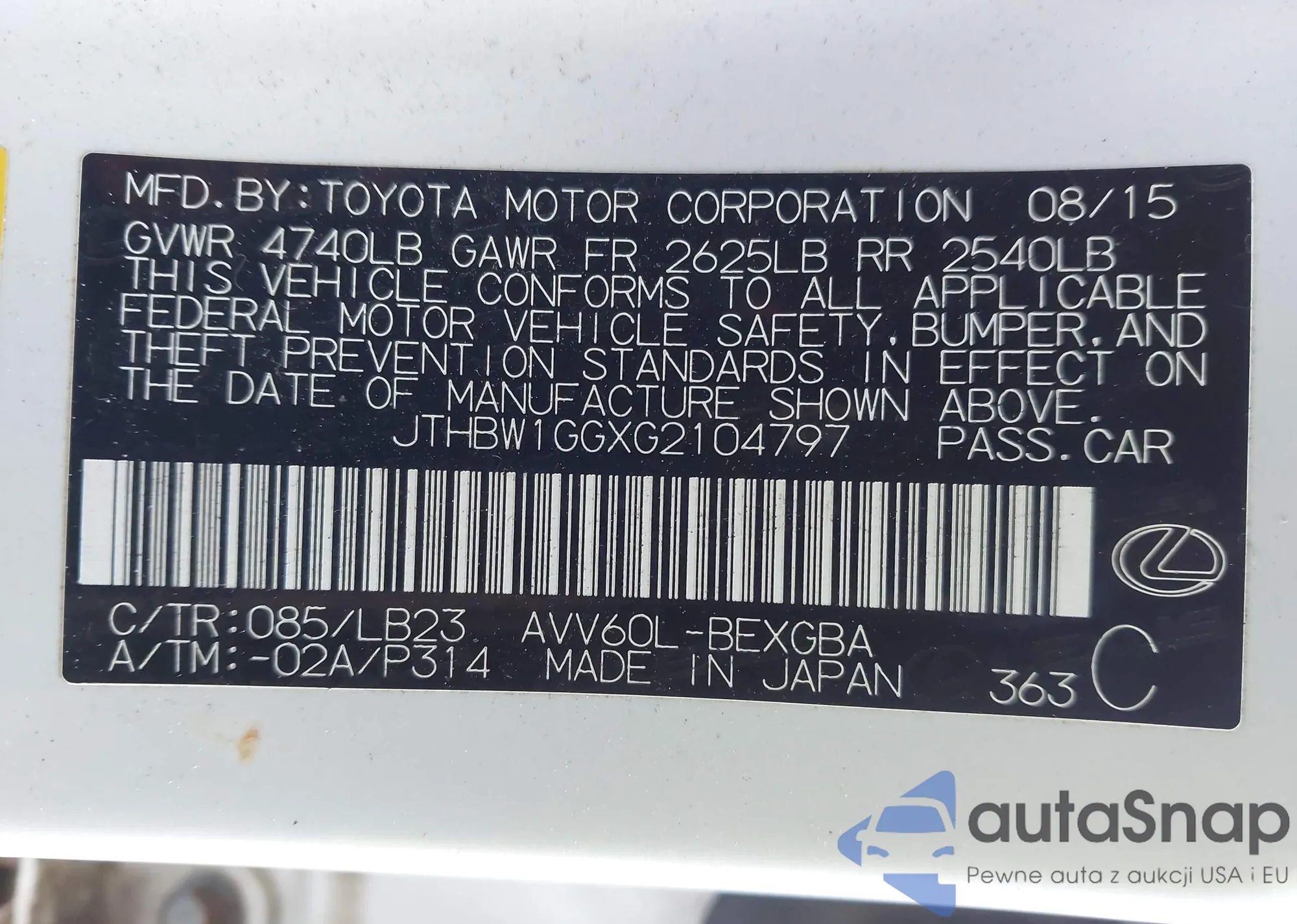 • VIN: JTHBW1GGXG2104797
