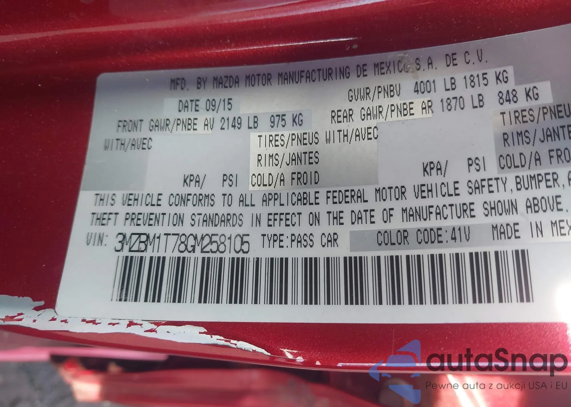 Samochód Mazda 3 2016 (VIN 3MZBM1T78GM258105) nie był wcześniej licytowany. Dokumenty są czyste, przebieg odpowiada lub jest niższy niż średnia rynku. Sprzedaje go firma ubezpieczeniowa – polecamy zakup. Dostawa do portu zajmie ok. 6–8 tygodni.