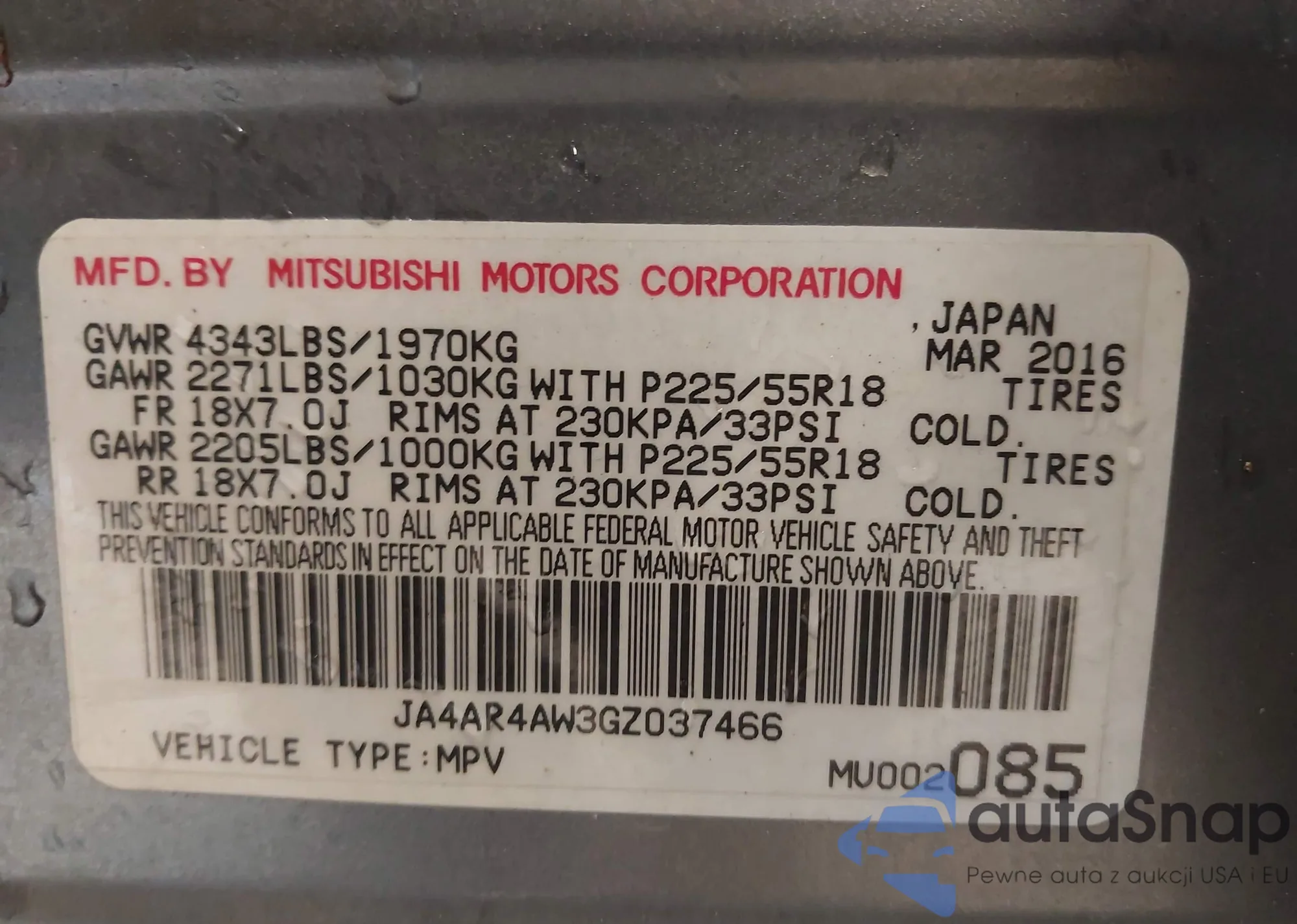 Samochód Mitsubishi Outlander 2016 (VIN JA4AR4AW3GZ037466) nie był wcześniej licytowany. Dokumenty są czyste, przebieg odpowiada lub jest niższy niż średnia rynku. Sprzedaje go firma ubezpieczeniowa – polecamy zakup. Dostawa do portu zajmie ok. 6–8 tygodni.