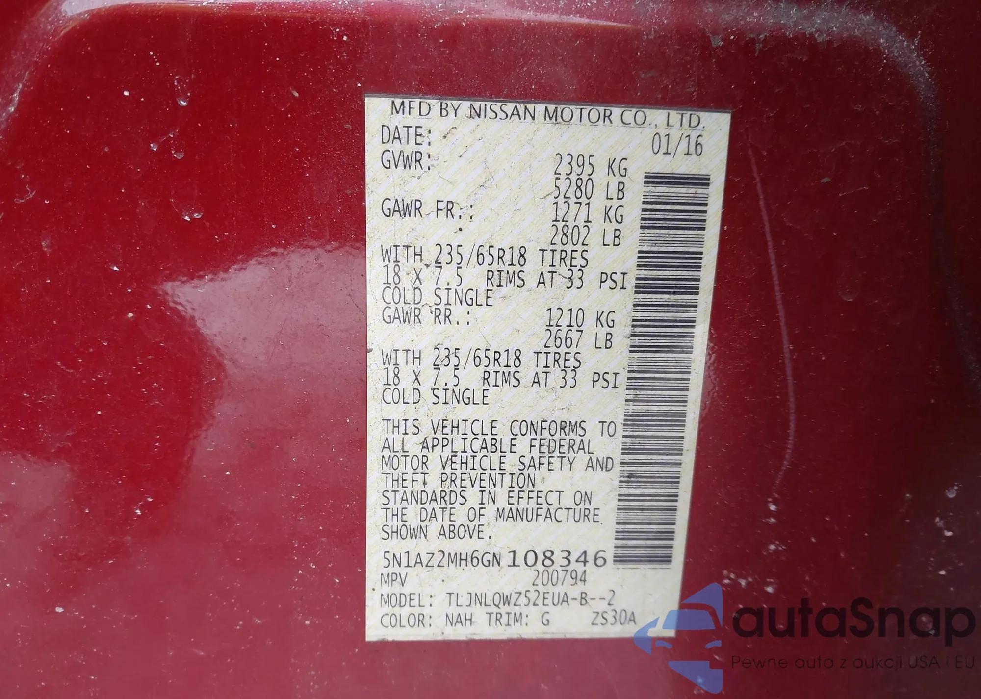 Samochód Nissan Murano 2016 (VIN 5N1AZ2MH6GN108346) nie był wcześniej licytowany. Dokumenty są czyste, przebieg odpowiada lub jest niższy niż średnia rynku. Sprzedaje go firma ubezpieczeniowa – polecamy zakup. Dostawa do portu zajmie ok. 6–8 tygodni.