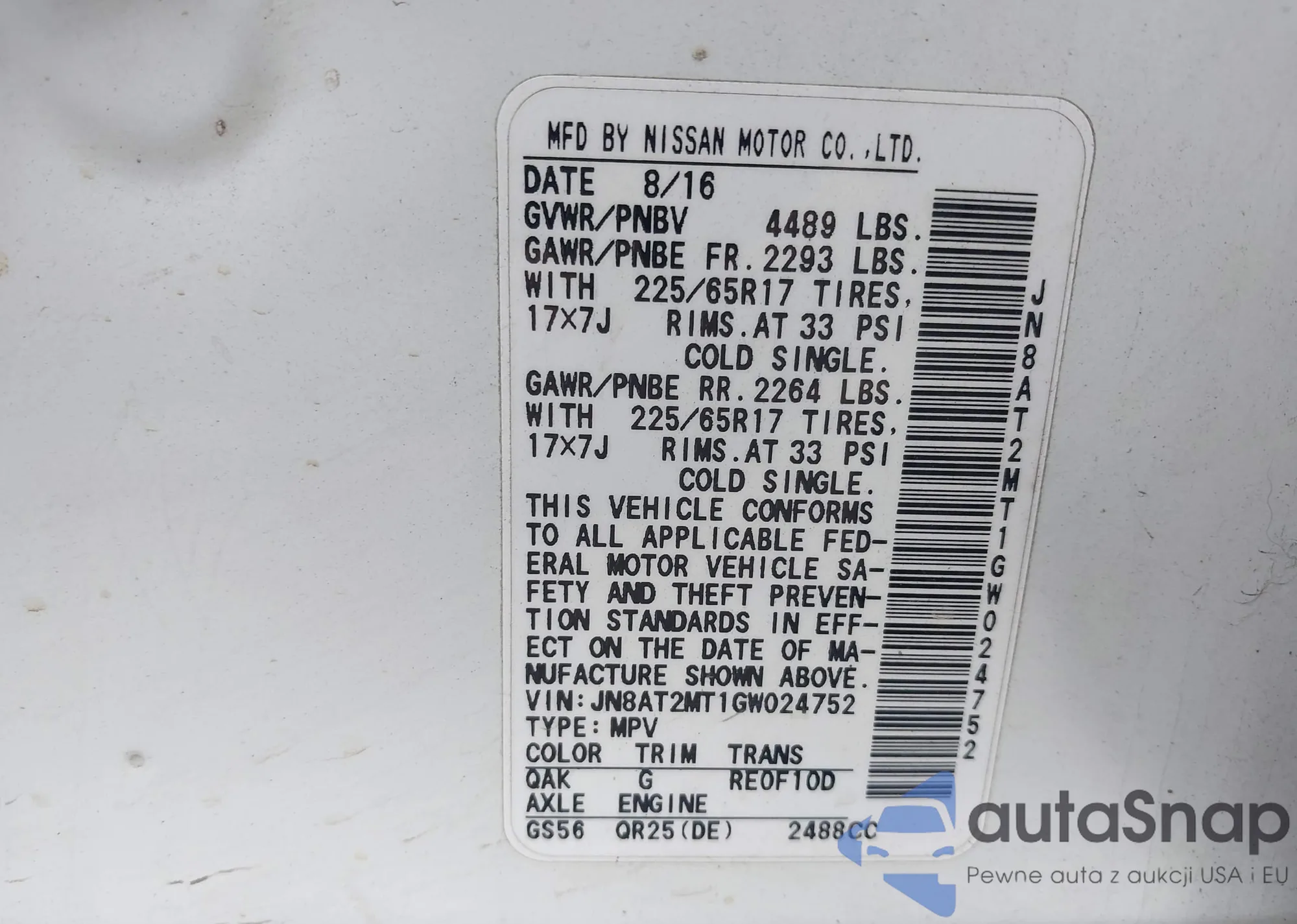 Samochód Nissan Rogue 2016 (VIN JN8AT2MT1GW024752) nie był wcześniej licytowany. Dokumenty są czyste, przebieg odpowiada lub jest niższy niż średnia rynku. Sprzedaje go firma ubezpieczeniowa – polecamy zakup. Dostawa do portu zajmie ok. 6–8 tygodni.