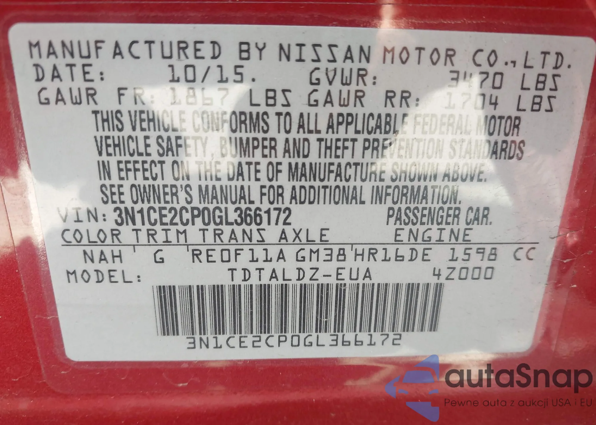 Samochód Nissan Versa 2016 (VIN 3N1CE2CP0GL366172) nie był wcześniej licytowany. Dokumenty są czyste, przebieg odpowiada lub jest niższy niż średnia rynku. Sprzedaje go firma ubezpieczeniowa – polecamy zakup. Dostawa do portu zajmie ok. 6–8 tygodni.