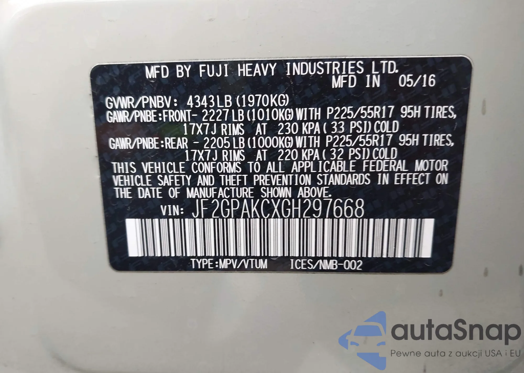 VIN: JF2GPAKCXGH297668