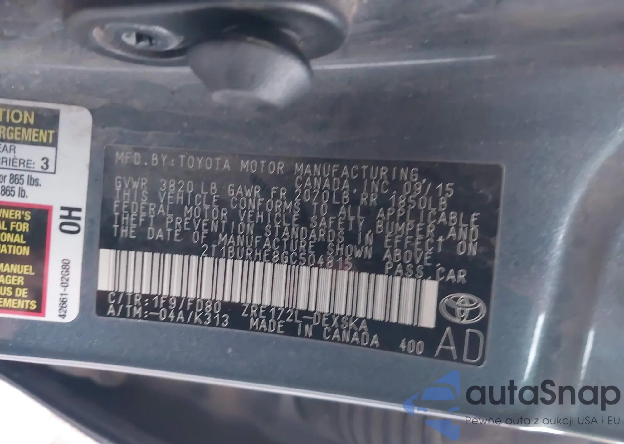 Samochód Toyota Corolla 2016 (VIN 2T1BURHE8GC504815) nie był wcześniej licytowany. Dokumenty są czyste, przebieg odpowiada lub jest niższy niż średnia rynku. Sprzedaje go firma ubezpieczeniowa – polecamy zakup. Dostawa do portu zajmie ok. 6–8 tygodni.