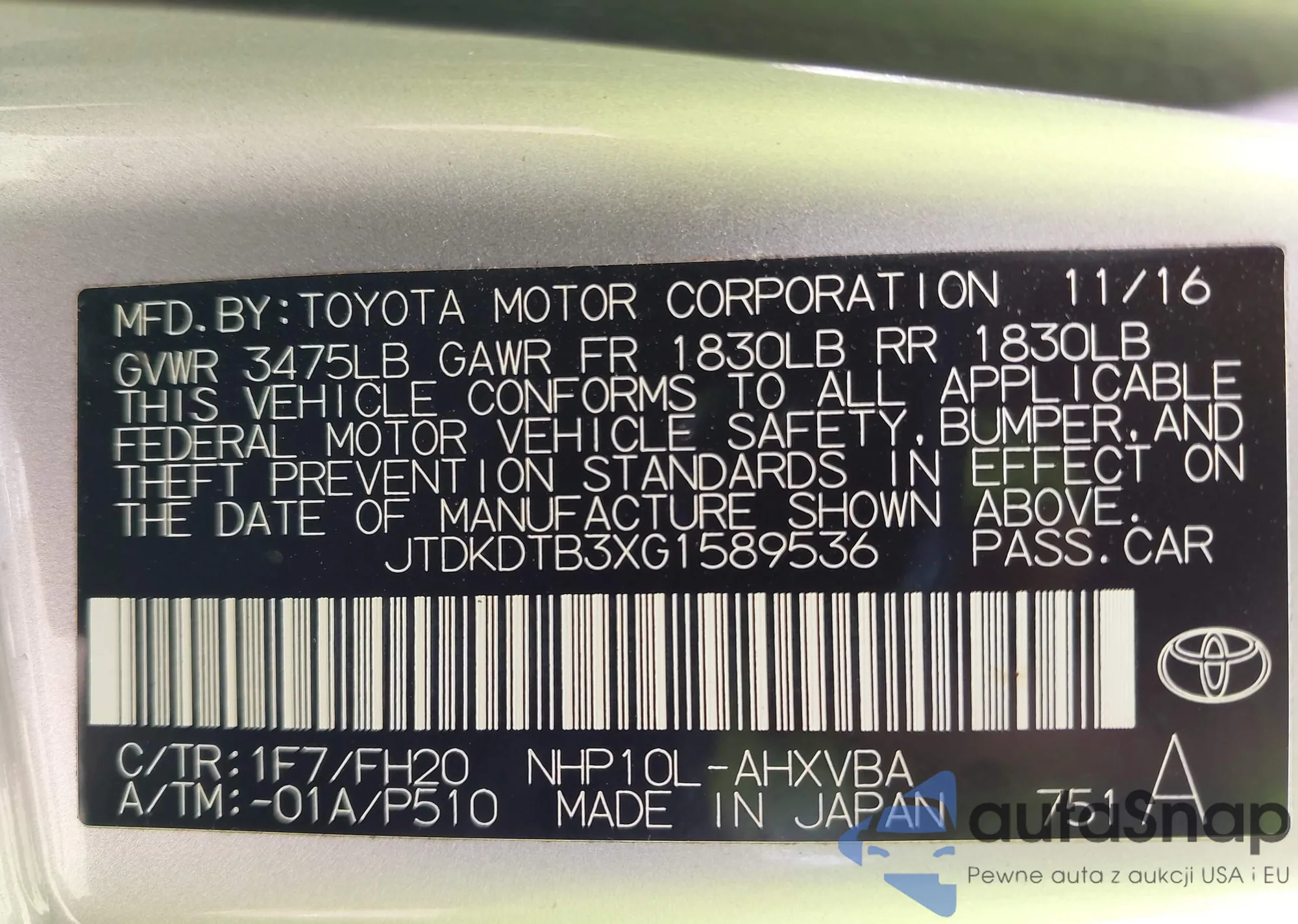 Samochód Toyota Prius c 2016 (VIN JTDKDTB3XG1589536) nie był wcześniej licytowany. Dokumenty są czyste, przebieg odpowiada lub jest niższy niż średnia rynku. Sprzedaje go firma ubezpieczeniowa – polecamy zakup. Dostawa do portu zajmie ok. 6–8 tygodni.