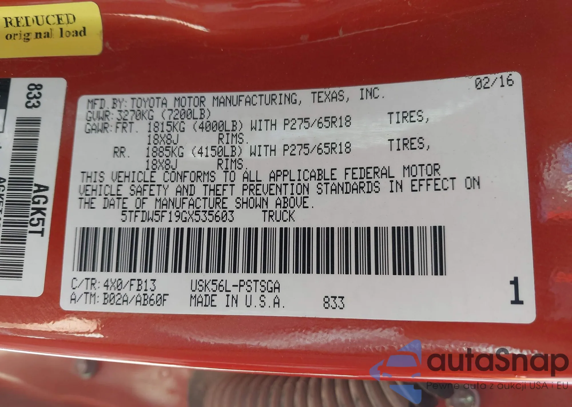 Samochód Toyota Tundra 2016 (VIN 5TFDW5F19GX535603) nie był wcześniej licytowany. Dokumenty są czyste, przebieg odpowiada lub jest niższy niż średnia rynku. Sprzedaje go firma ubezpieczeniowa – polecamy zakup. Dostawa do portu zajmie ok. 6–8 tygodni.