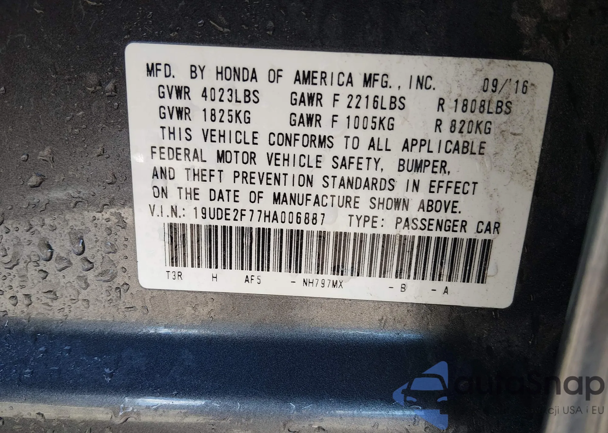 • VIN: 19UDE2F77HA006887